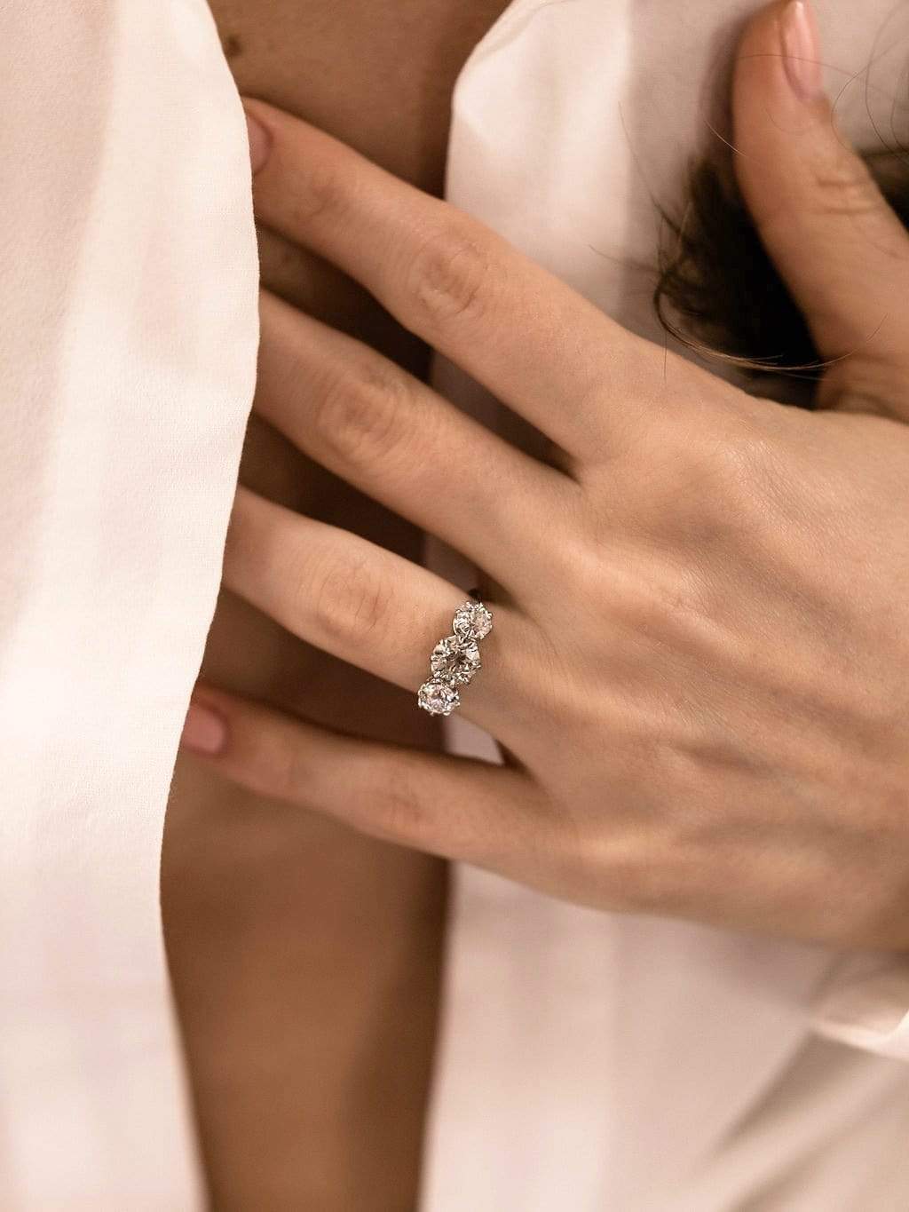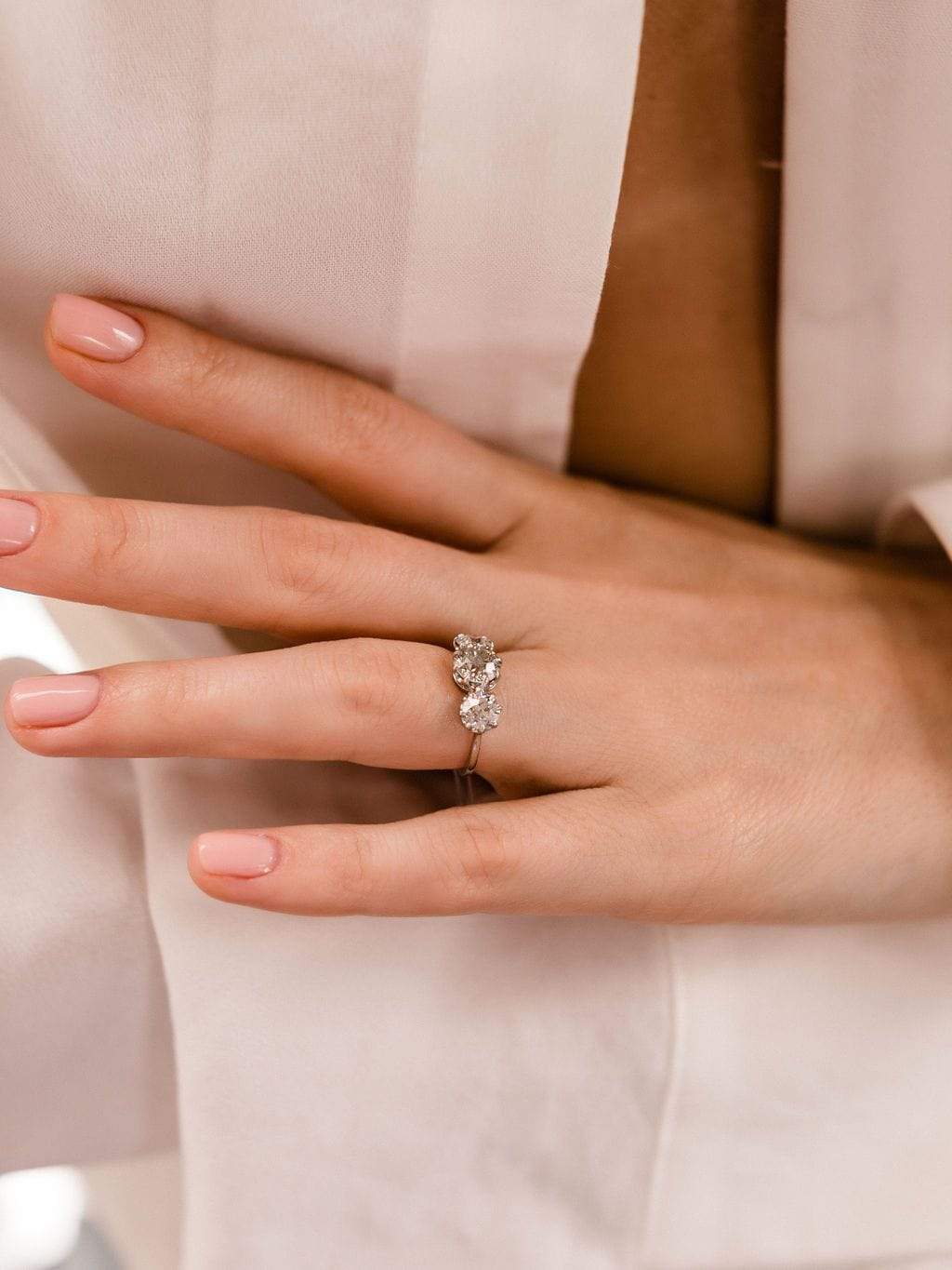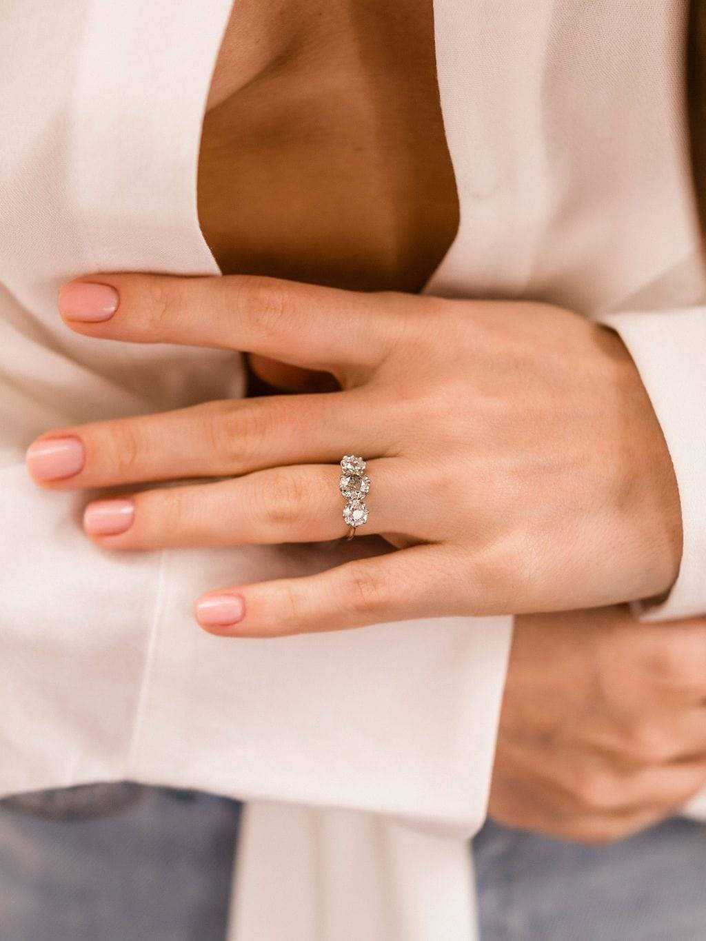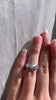 We love the uniqueness of the antique grey diamond and the contrast against the crisp, white OECs! A beautiful spread across the finger that plays nicely with bands!