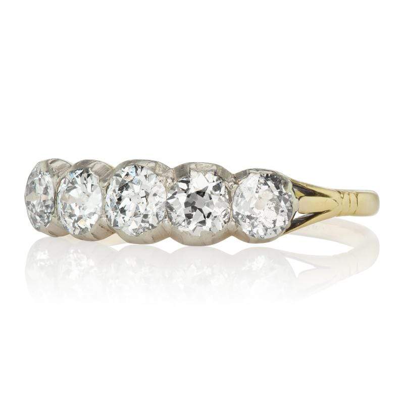 The Ronnie ring is an authentic vintage Edwardian piece! This Half Collet Set 5 Stone Engagement Ring has five old European cut diamonds that combine for approximately 1.50 carats of J-K color, VS clarity. The diamonds are half-collet-set in platinum-topped 18 karat yellow gold! The band is currently size 9 and can be resized!