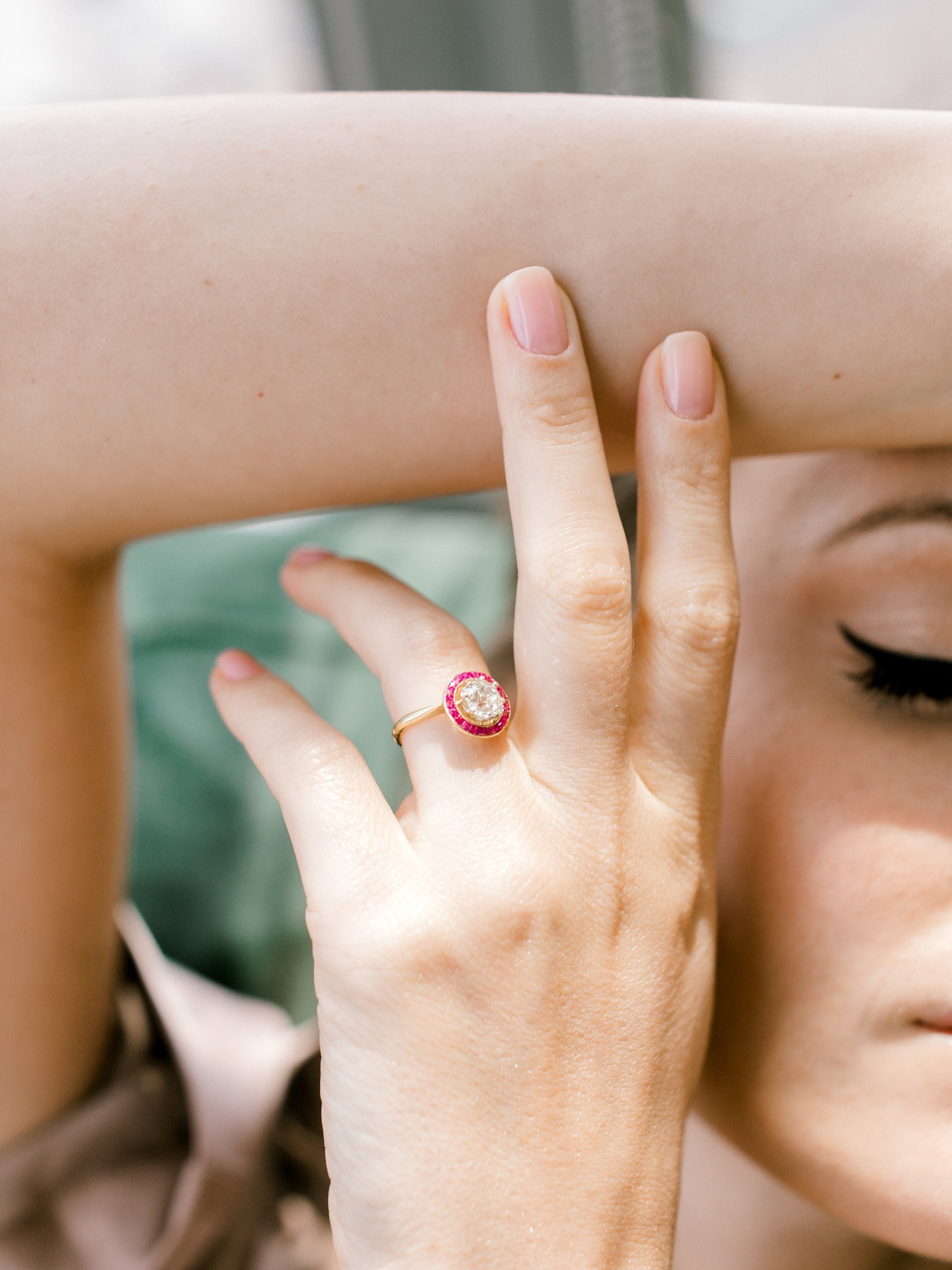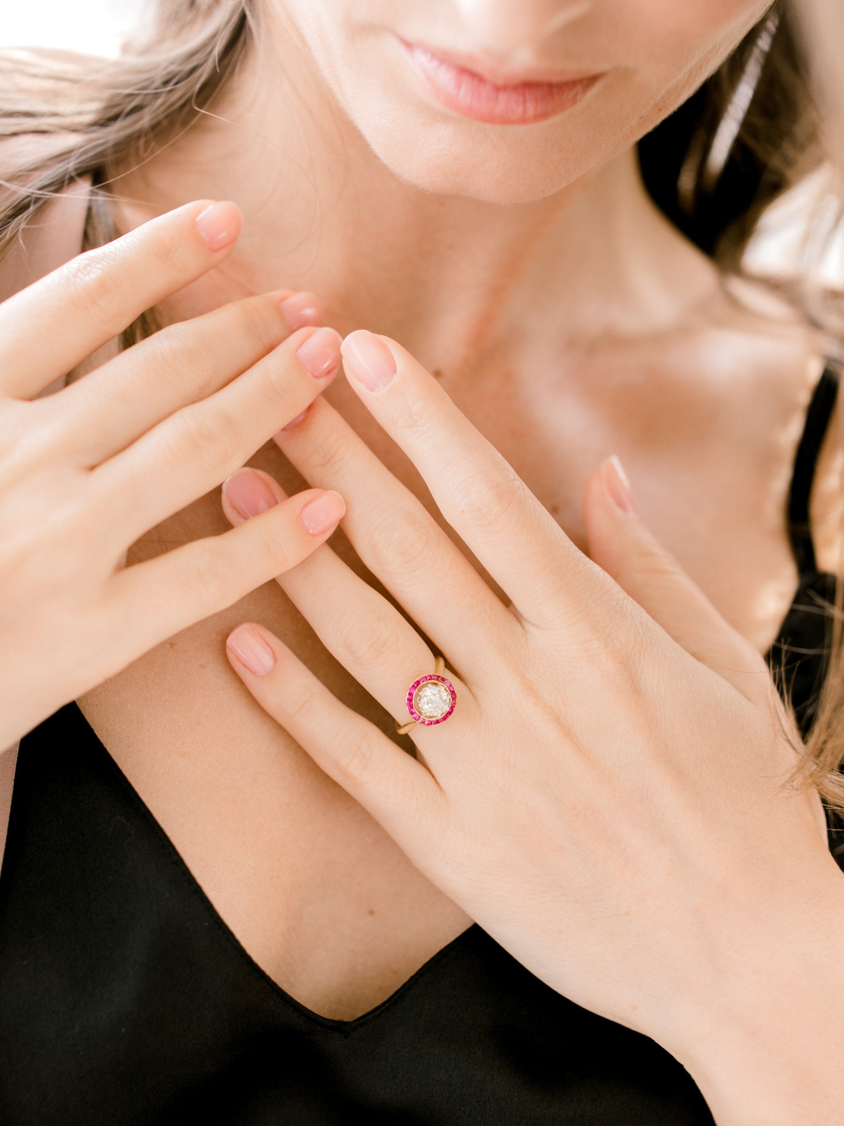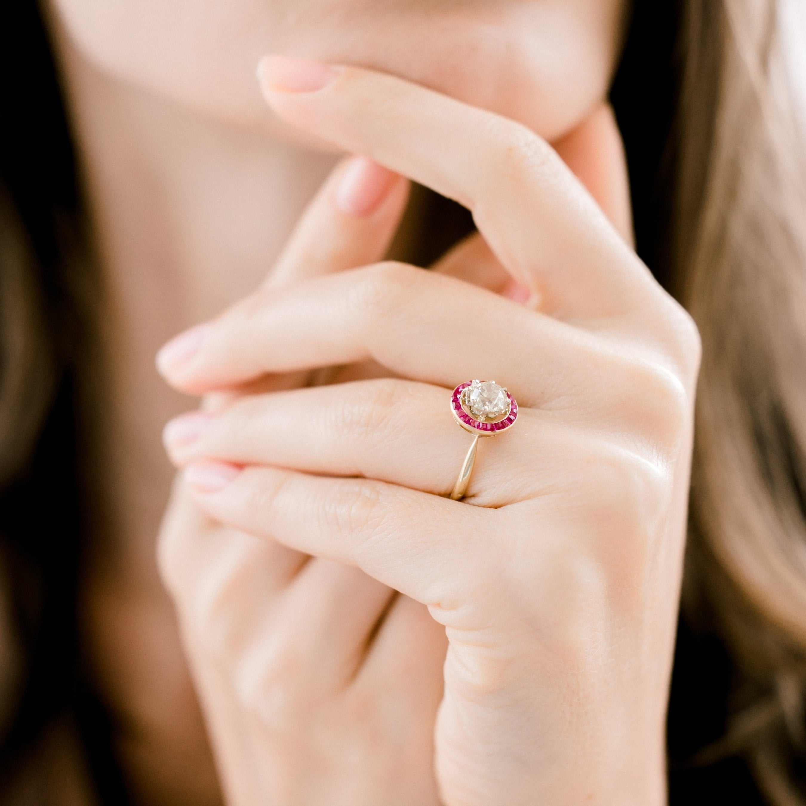 A gorgeous creation with so much character! The center diamond has absolutely gorgeous faceting and is accented beautifully by the pop of color in the ruby halo!