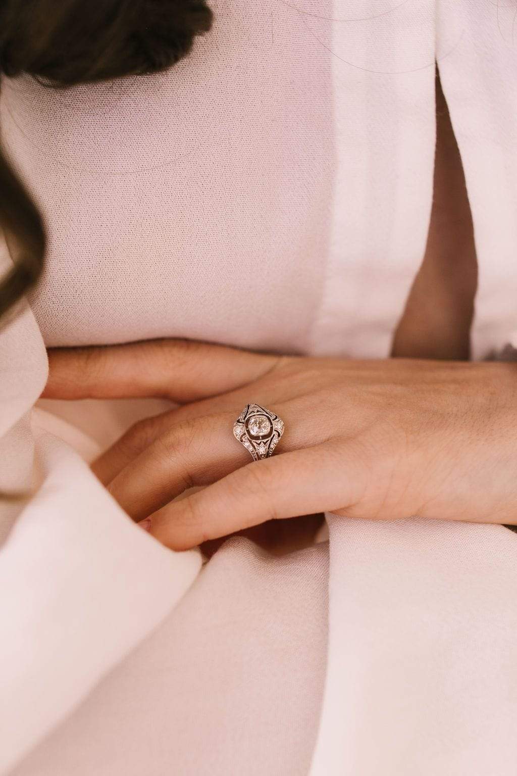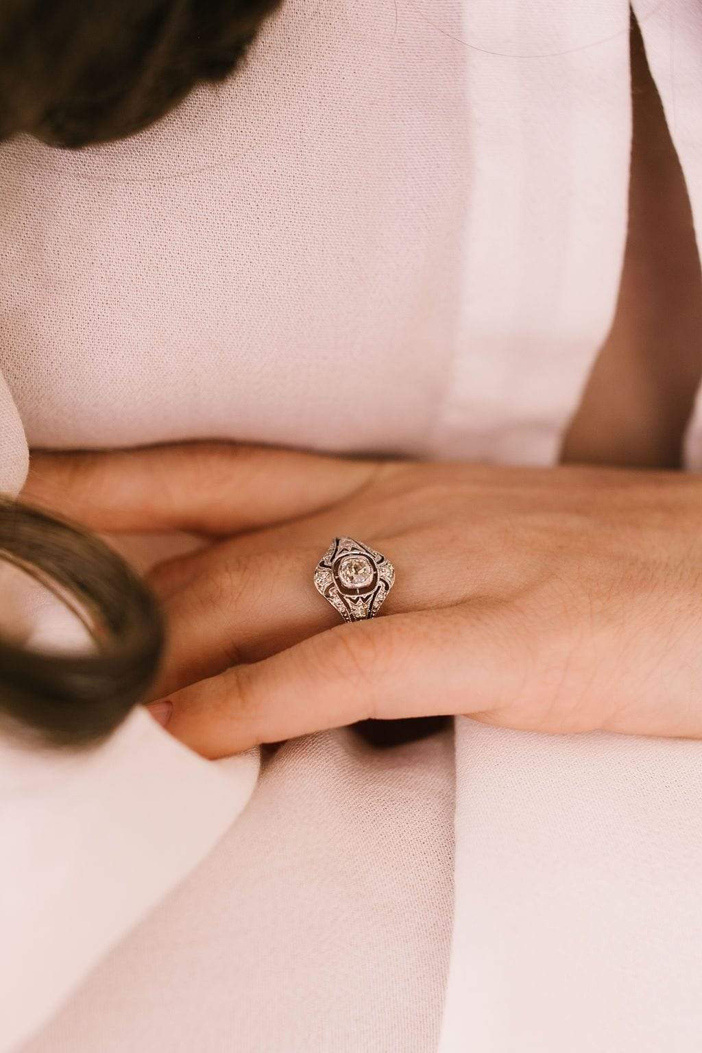 Classic Edwardian with the two-tone setting and gorgeous metalwork! The ring is super low profile with a beautiful shape and look!
