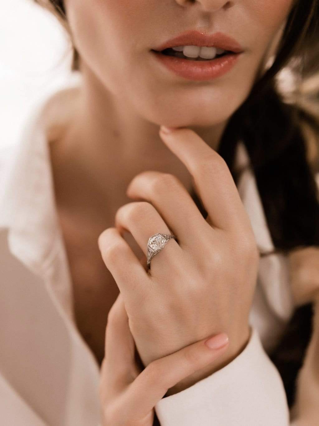 The Ginger ring is an authentic vintage engagement ring from the Art Deco era circa 1920! This Hexagon Shaped Bezel Set Engagement Ring centers a GIA certified 1.46-carat old European cut diamond of I color, VS1 clarity. The diamond is set in hexagon-shaped bezel platinum setting. Two small diamonds are set into each shoulder. The gallery is laden with gorgeous filigree. The shank has a slight knife's edge with hand engravings! The ring is currently size 6.5 and can be resized!
