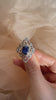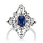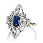 The Hilde ring is an authentic vintage diamond and sapphire cocktail ring from the Edwardian Era circa 1900. The ring centers a GIA-certified No Heat Cambodian cushion cut sapphire of approximately 1.00-carat. 32 Old Mine Cut Diamonds of approximately 0.30-carats, H-I color are set throughout the ring. The stone is bezel set in an intricate platinum and 18kt yellow gold setting. The ring is currently size 8 and can be resized!