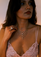 The Corsair necklace is an authentic vintage diamond corsage necklace from the Edwardian Era circa 1910. The necklace features 51 diamonds of approximately K-L-M-N color, VS-SI clarity, all together totaling approximately 11.43 carats. The diamond cuts range from Old Mine Cuts, Oval Cuts, Rose Cuts, and Pear Cuts. The stones are bezel-set in 18kt yellow gold. The necklace has two clasp options to allow for different lengths!