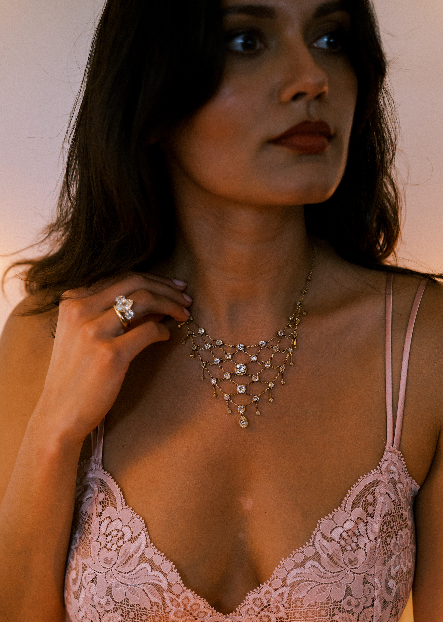 This absolutely stunning antique necklace is a once-in-a-lifetime find! It is clear that incredible care was taken to select each and every diamond to give this necklace a cohesive, flowing looking. Delicate golden chains connect each stone to allow for a beautiful drape across the neck. A one-of-a-kind piece we're tempted to keep for our own personal collection!