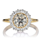 We are always on the search for uniquely-colored diamonds, and this gorgeous, gray antique diamond does it for us! We love the earthy tones and perfectly floral faceting of this one-of-a-kind beauty. A halo of whiter diamonds beautifully contrasts in color, and gives the ring an utterly unique, antique feel.