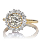 The Riley 1.68 ring is an AB original design made right here in NYC. The ring centers a GIA-certified 1.68-carat Transitional Cut diamond of Fancy Gray color, SI2 clarity. A halo of 14 Old Cut diamonds surround the center stone, grading approximately H-I color, VS clarity, all combining for 0.47-carats. The stones are set in a two-tone platinum and 18kt yellow gold setting. The ring is currently size 6 and can be resized!