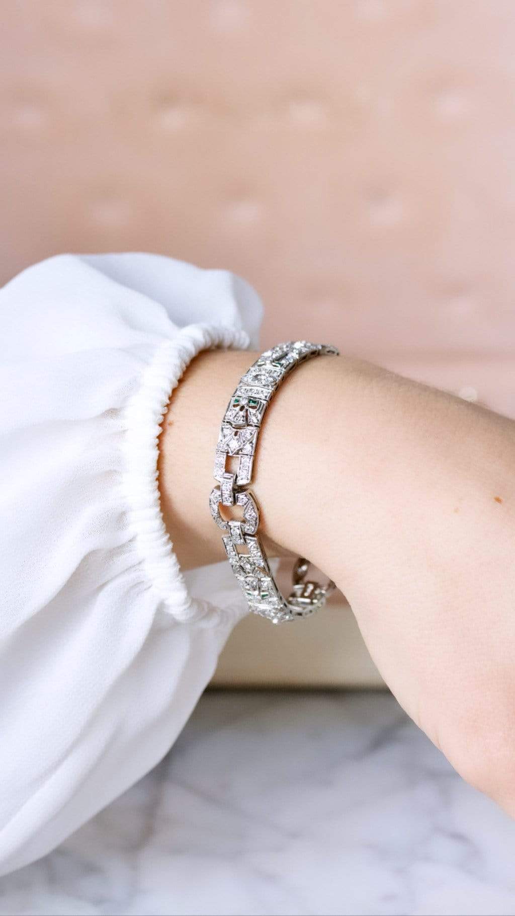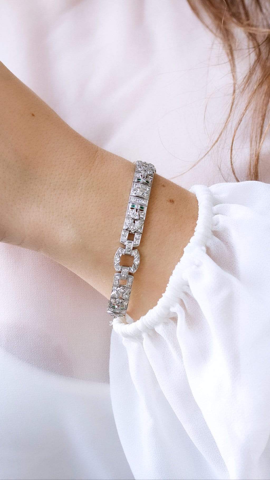 The James bracelet is an authentic Art Deco piece circa 1920. The bracelet has 135 single-cut diamonds of H-I color, VS-I1 clarity that combine for approximately 3.75 carats. Twelve french cut synthetic emeralds* are set into the bracelet, adding a pop of color to this platinum beauty. The stones are set into a platinum setting and the bracelet is 7.25" long.