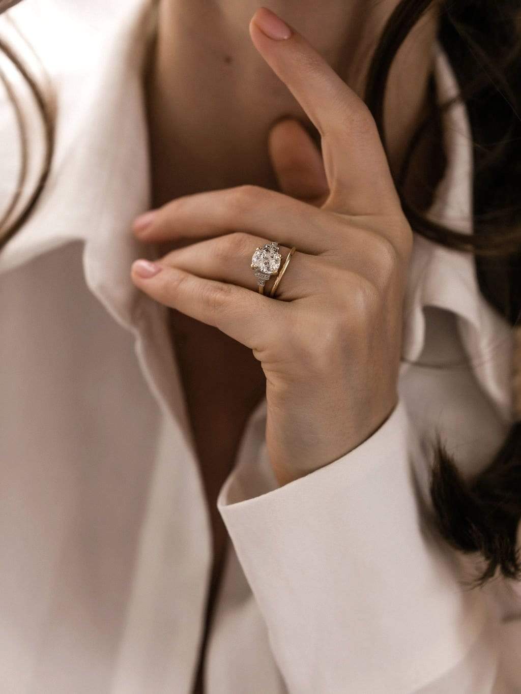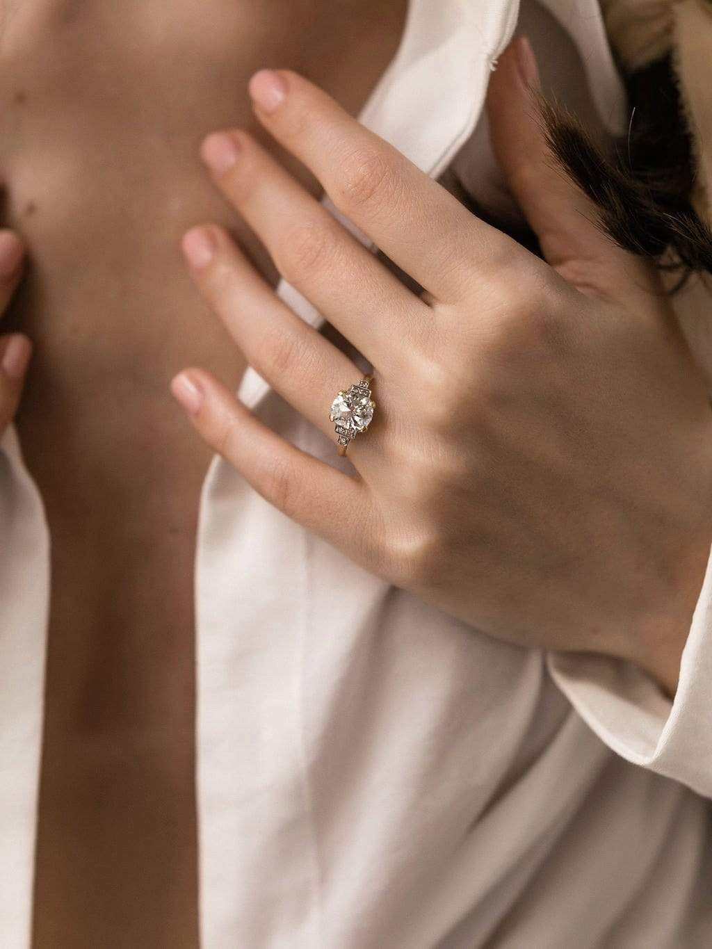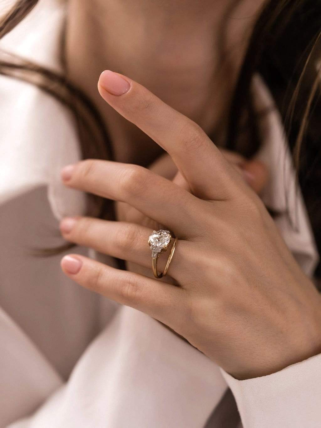 This diamond is so unique with its beautiful antique cushion shape and the faceted table which makes it a Jubilee AND incredibly sparkly! Set in a simple two-tone setting that spreads the finger so beautifully!