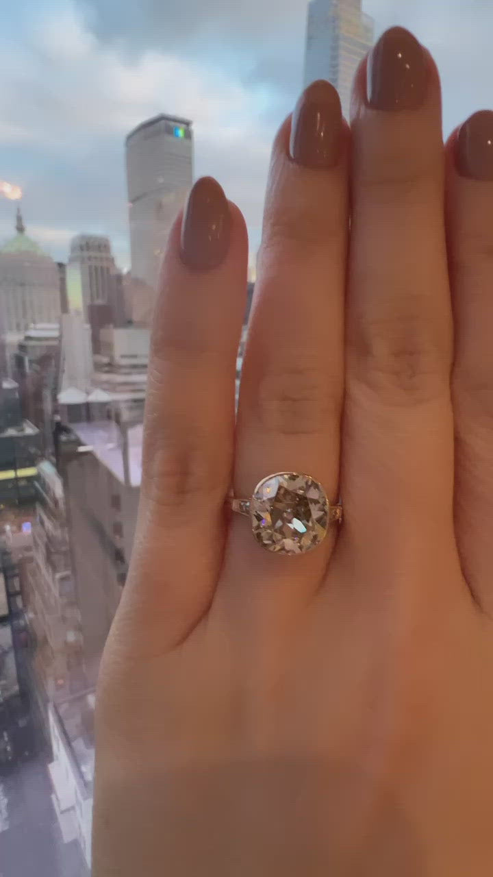 The Kendra 5.03 ring is an AB original design made right here in NYC. The ring centers a GIA-certified 5.03-carat old mine cut diamond of Fancy Brownish Greenish Yellow color, VS2 clarity. The stone is bezel-set in an 18 karat yellow gold setting with 2 old cut diamonds on each shoulder. The ring is currently size 6.5 and can be resized!