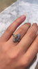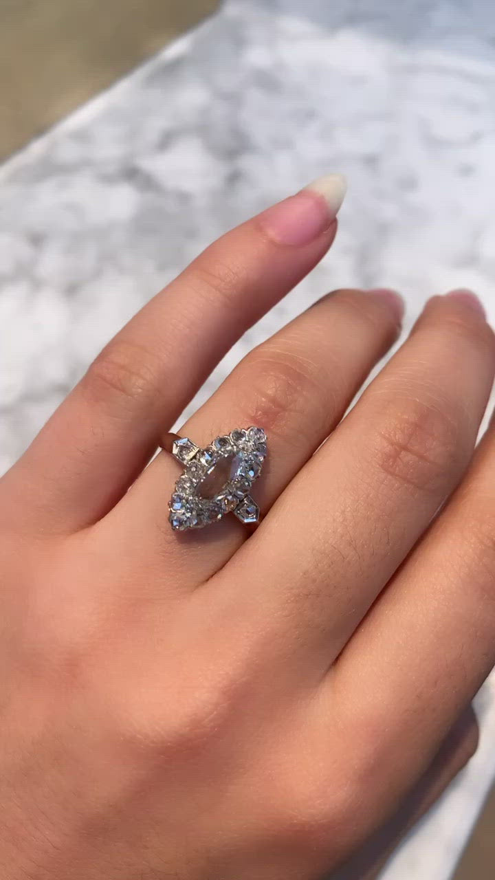 The Kingston ring is an authentic vintage ring from the Edwardian Era circa 1910. The ring centers a GIA certified 0.70-carat Oval Rose cut diamond of I color, SI1 clarity. Sixteen rose-cut diamonds are set into a platinum halo surrounding the centermost stone. An additional rose cut diamond is bead-set into each shoulder of the ring. The side stones in the halo and shoulders combine for approximately 0.60 carats and are of coordinating color and clarity. The stones are set in a platinum-topped 18 karat rose gold setting. The ring is currently size 8.25 and can be resized!