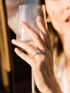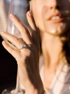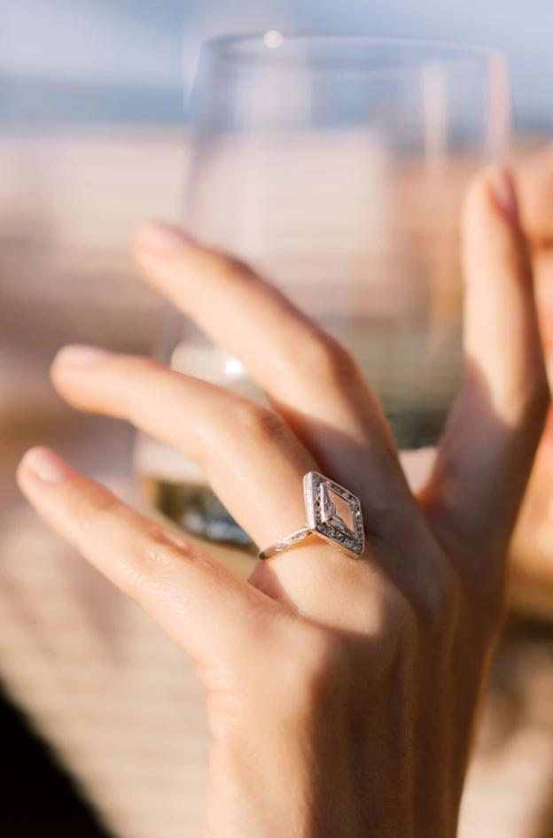 Our favorite combo of bold and delicate. The face of the ring is a unique lozenge shape with gorgeous stones. The ring is super low profile for an easy wear.