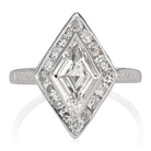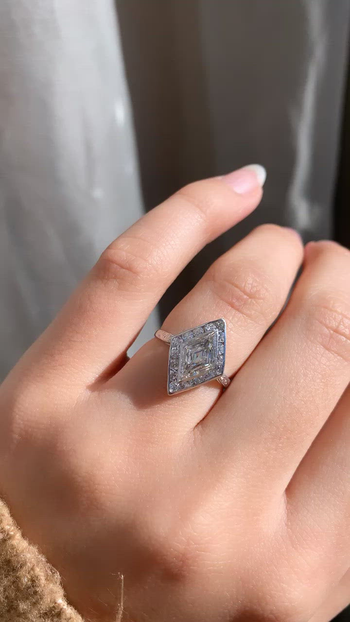 The Penelope ring is a vintage kite shaped engagement ring from the Art Deco Era. The ring centers a GIA certified 1.04-carat Lozenge Step Cut diamond of H color, VS2 clarity. Surrounding the center stone is a halo of 19 channel-set old European cut diamonds. Delicate hand engravings decorate the gallery and shoulders of this ring. The ring is currently size 6 and can be resized!
