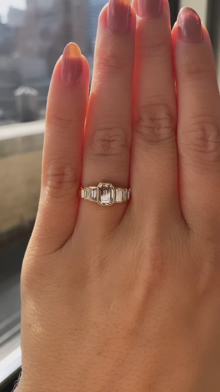 The Berry 1.41 ring is a VB original design made right here in NYC. The ring centers a GIA certified 1.41-carat Emerald cut diamond of N, Very Light Brown color, I1 clarity. Three vertically-set flanking diamond baguettes are on either side of the center stone. The stones are set in an 18 karat yellow gold setting. The ring is currently size 6.25 and can be resized!