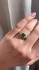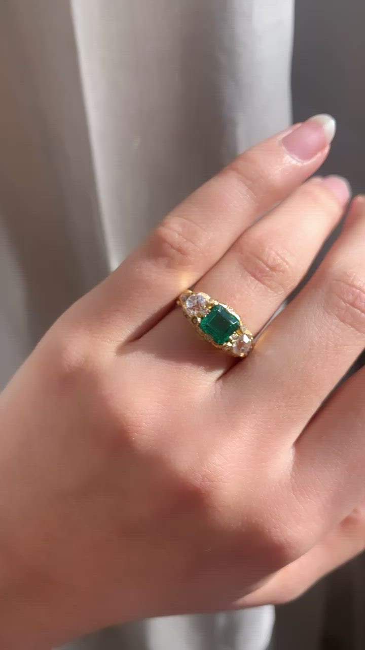 This ring is so chicly bold. We love the play on the sizes and the emerald to the gold combo. The old mine cut diamonds to each side of the emerald are just gorgeous!