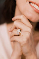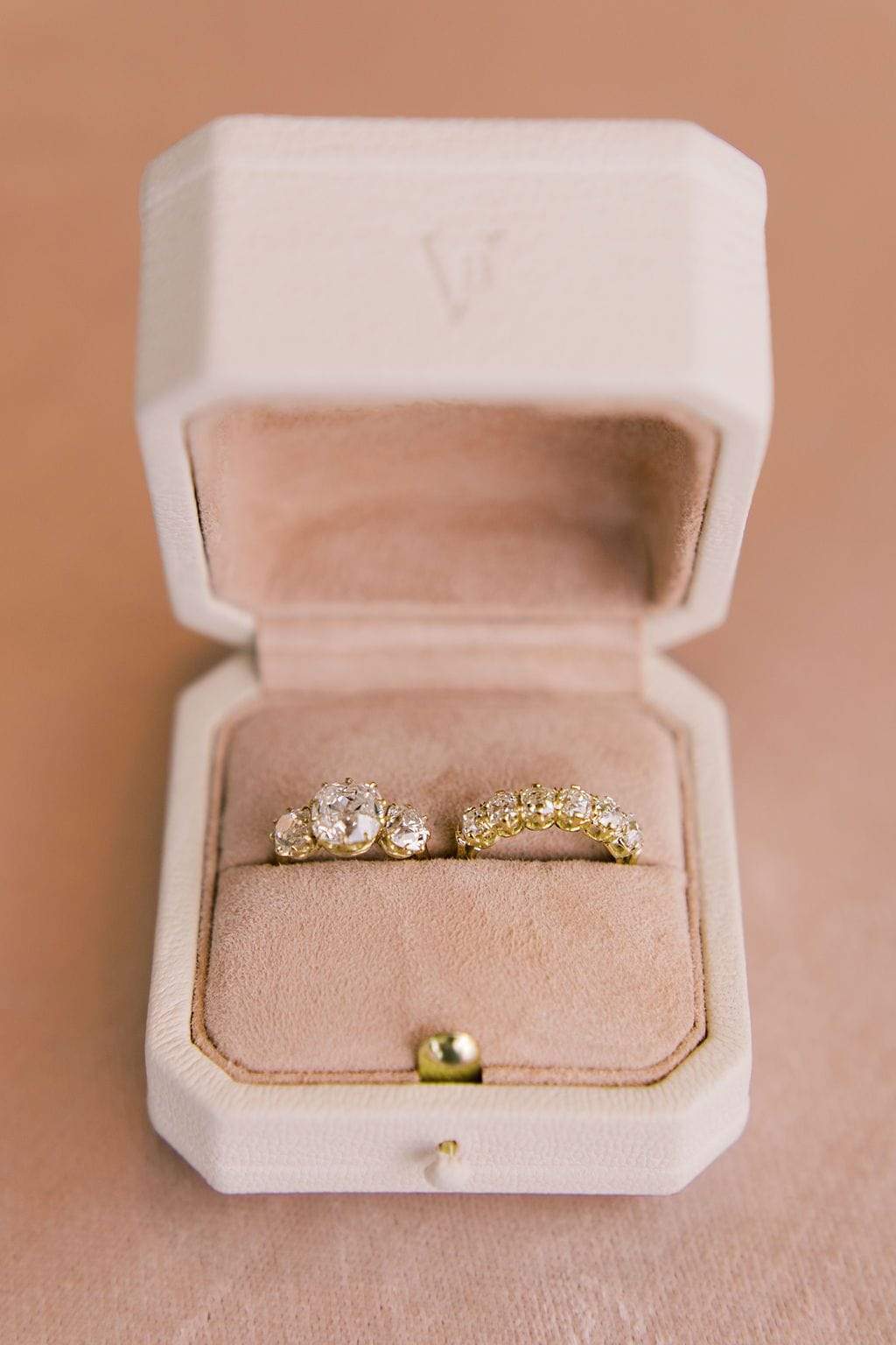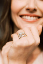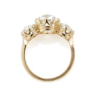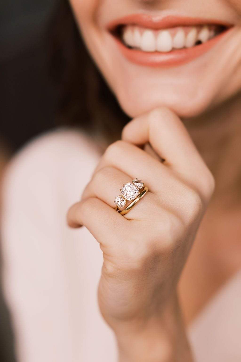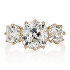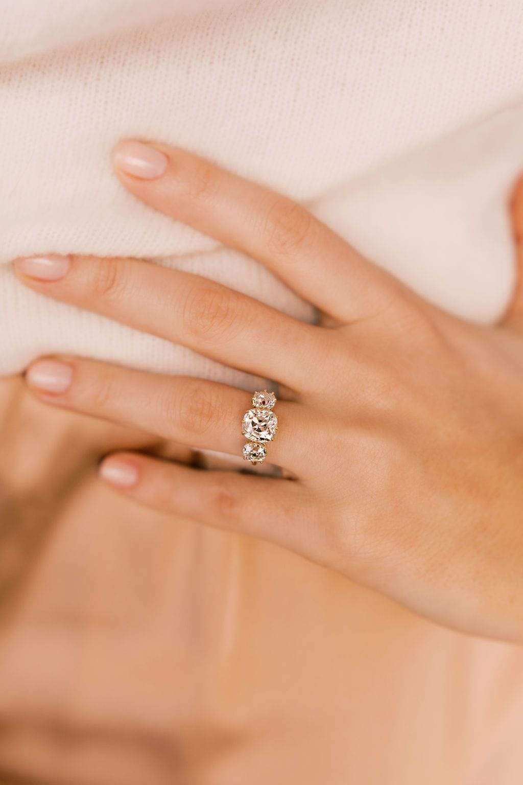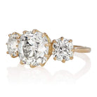 Our all-time favorite style, the Marielle ring is a gorgeous three-stone style that is low-profile and very stackable. This rendition features stunning, chunky old mine cuts that are vibrantly white and lively.