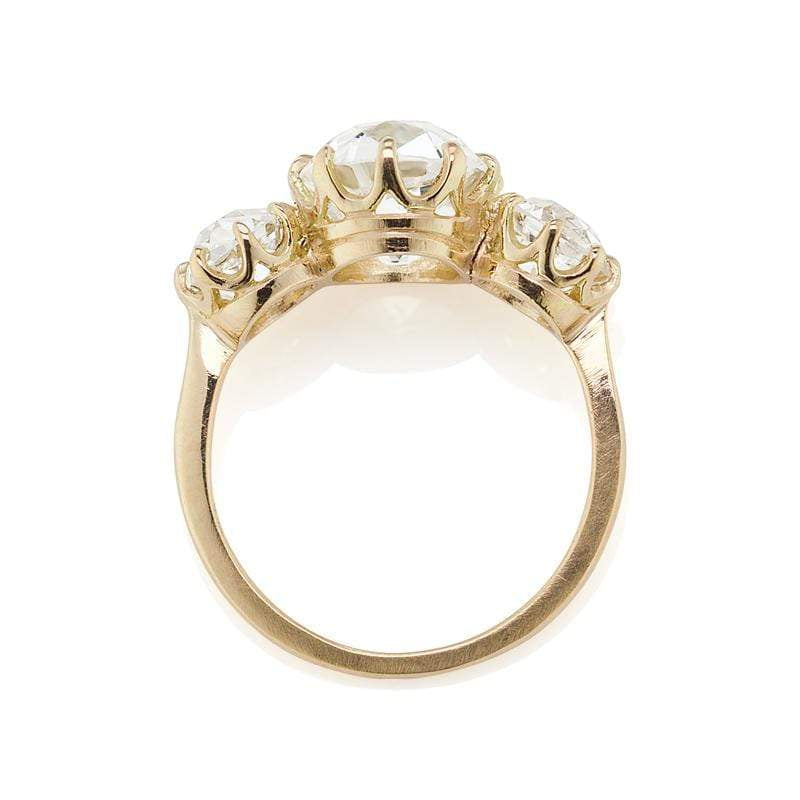 The Marielle 2.68 ring is a vintage-inspired VB-made diamond engagement ring. The ring centers a GIA certified 2.68-carat old mine cut diamond of I color, SI2 clarity. The stone is set in an 18-karat yellow gold setting. To each side of the center stone is an old mine cut diamond of approximately I-J color, VS clarity. The side stones combine for 1.54 carats. The ring is currently size 4.75 and can be resized!