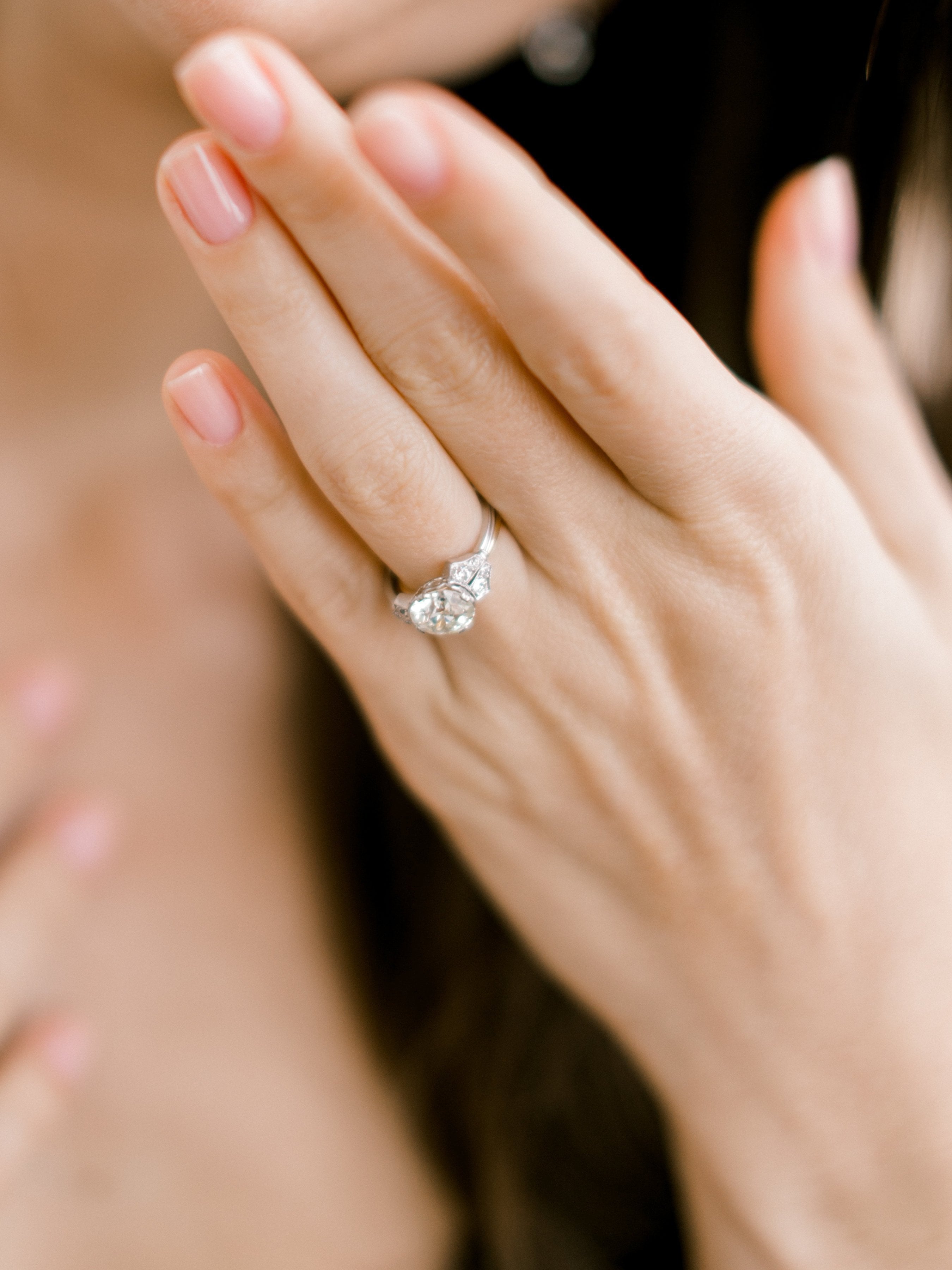 The Ivory ring is a low set diamond engagement ring from the Art Deco Era, circa 1925! The ring centers a GIA Certified 2.19 carat old European cut diamond of M color, VS2 clarity. The diamond is set in a low profile 4 prong platinum setting with super chic, almost winged shoulders that are each set with 4 old European cut diamonds decorated with fine millegrain and fluting detail continuing down the shank. The ring is size 6.25 and can be resized!