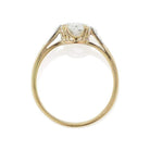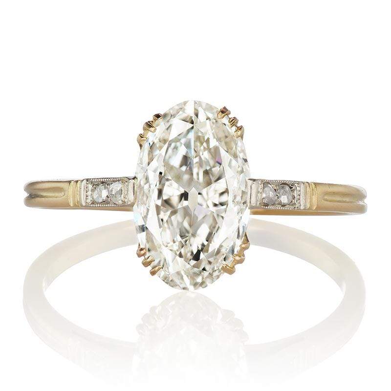 The Lucille ring is a vintage diamond engagement ring from the Art Deco Era. The ring centers a GIA certified 1.51-carat Oval cut diamond of I color, VVS2 clarity. The stone is set in a 4-double prong 14 karat yellow gold setting. Two rose cut diamonds are bead-set into the platinum shoulders of the ring. The ring is currently size 6 and can be resized!
