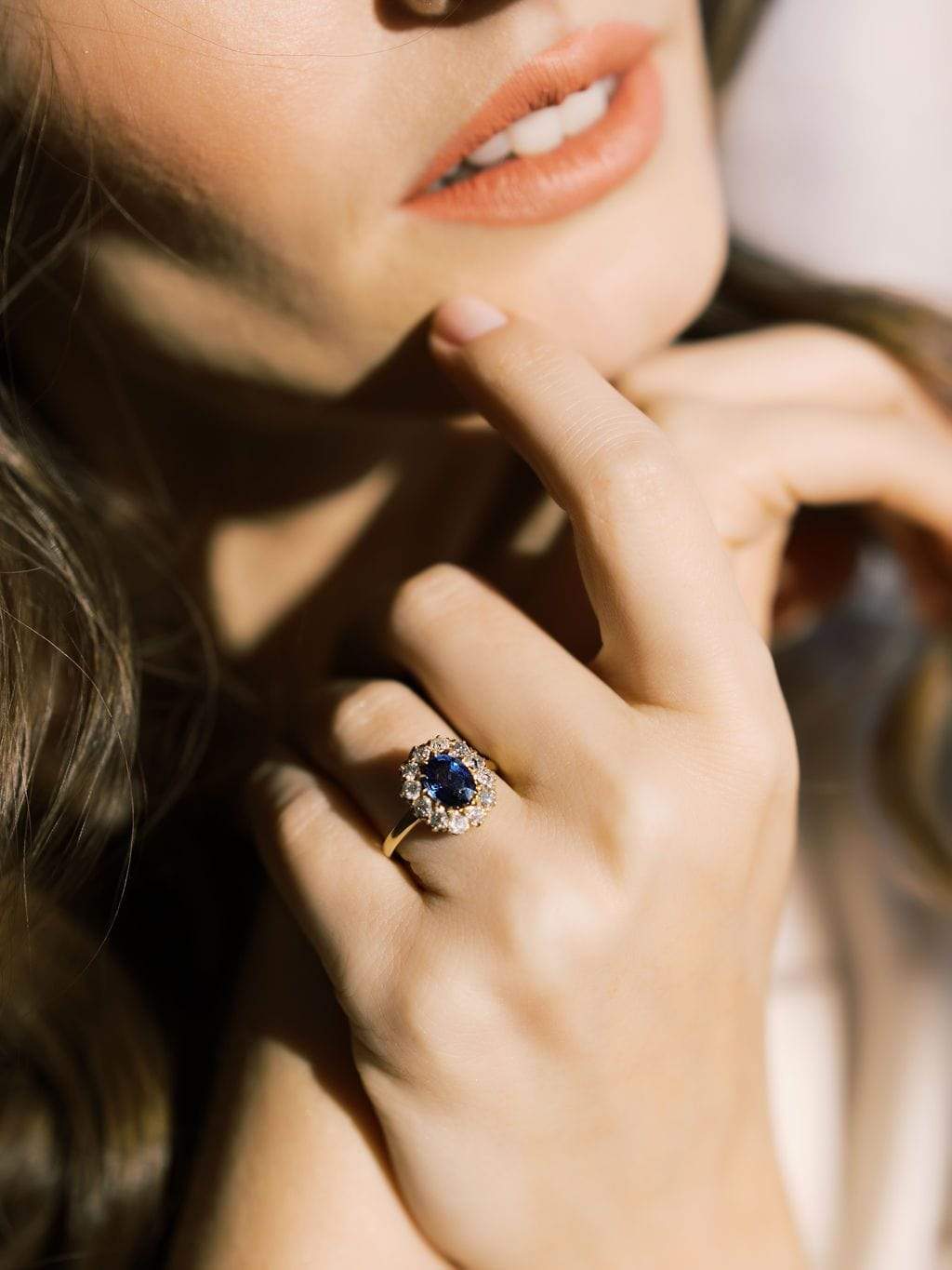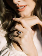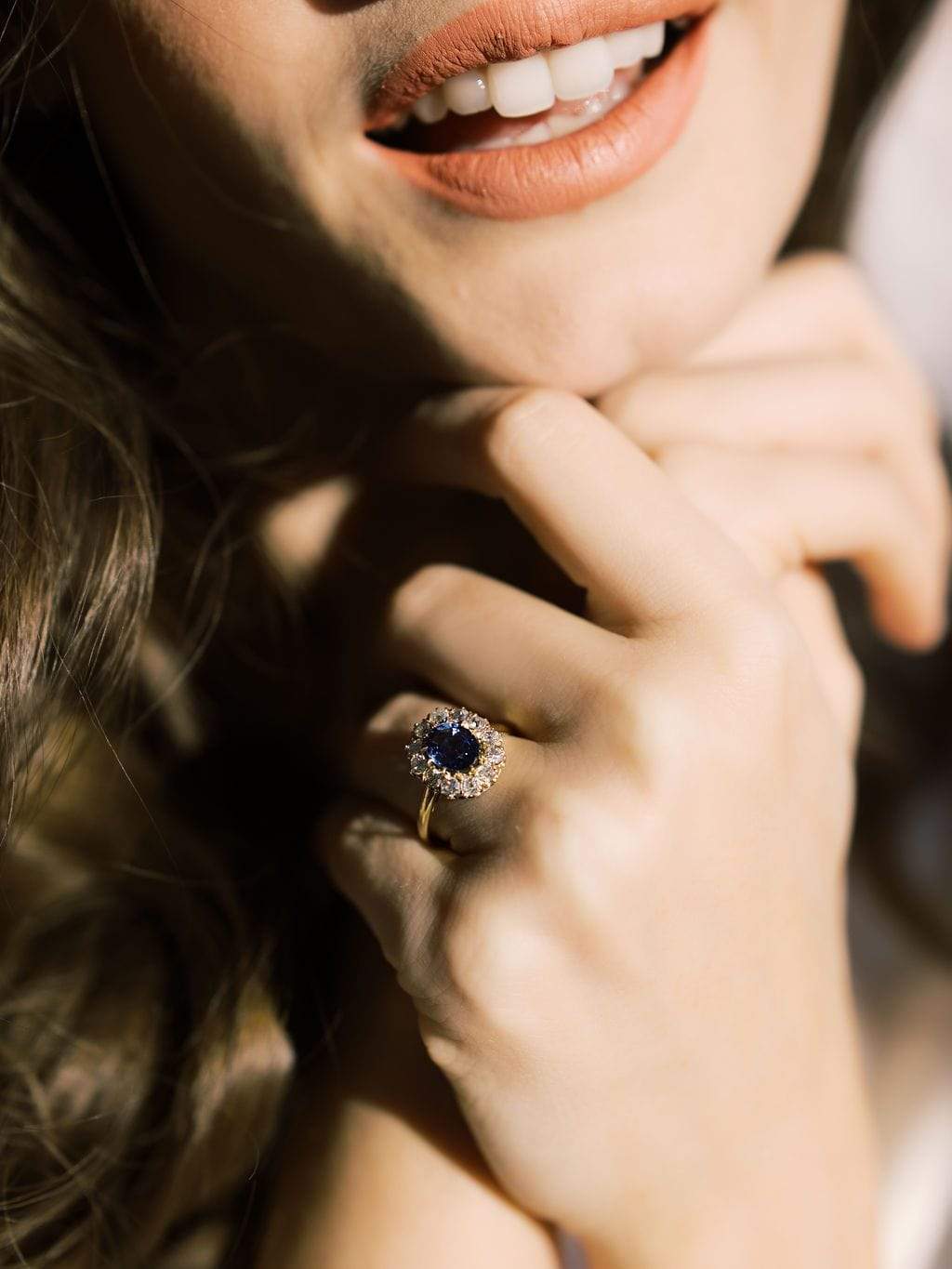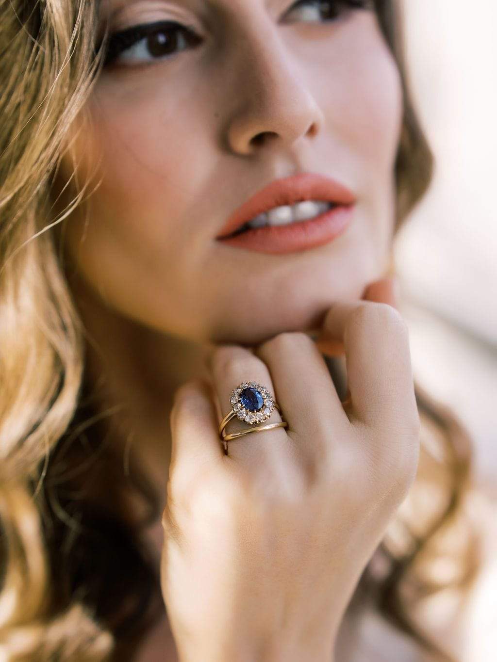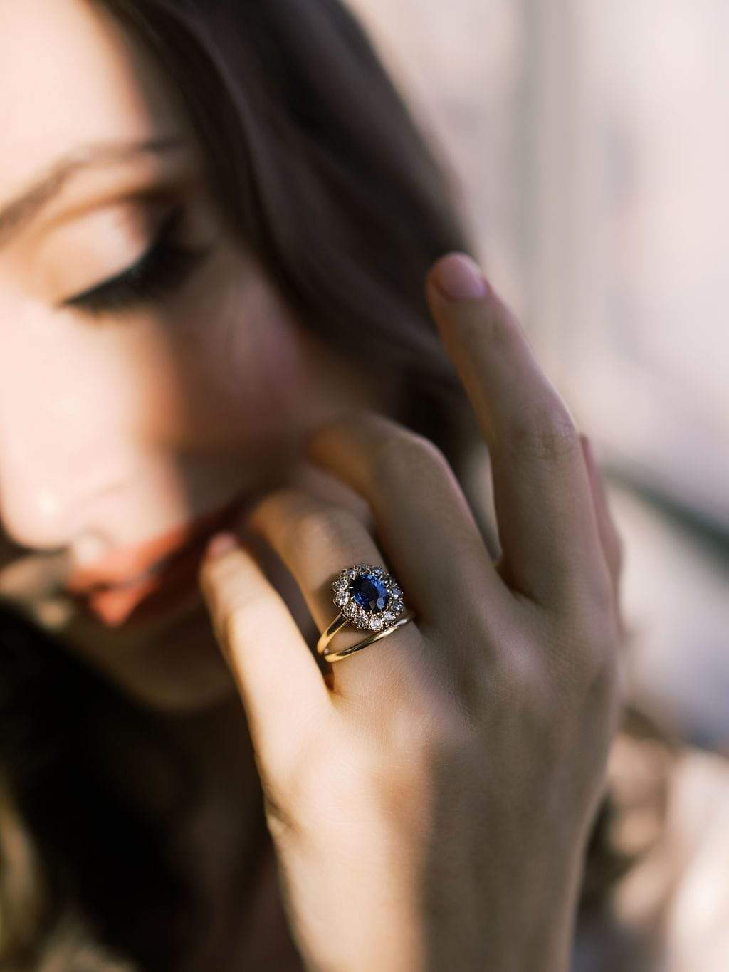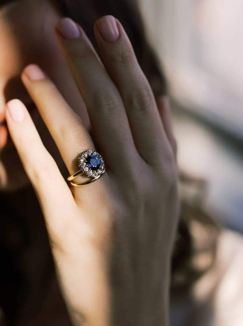 We love the vibrant color of this sapphire surrounded by a glittering halo of OECs. The ring has a slightly oval shape that makes it feel very elegant.