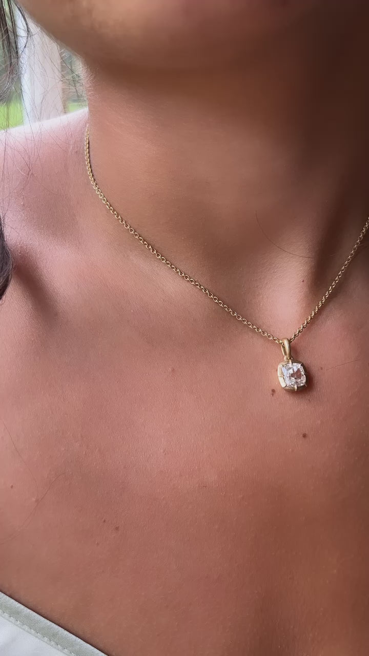 The Lulu Pendant 1.55 is an AB original made right here in NYC. The pendant features a GIA Certified 1.55-carat Old Mine Cut diamond of I color, SI1 clarity. The diamond is collet-set in an 18kt yellow gold setting with an 18kt gold bail to slide on any chain you desire.