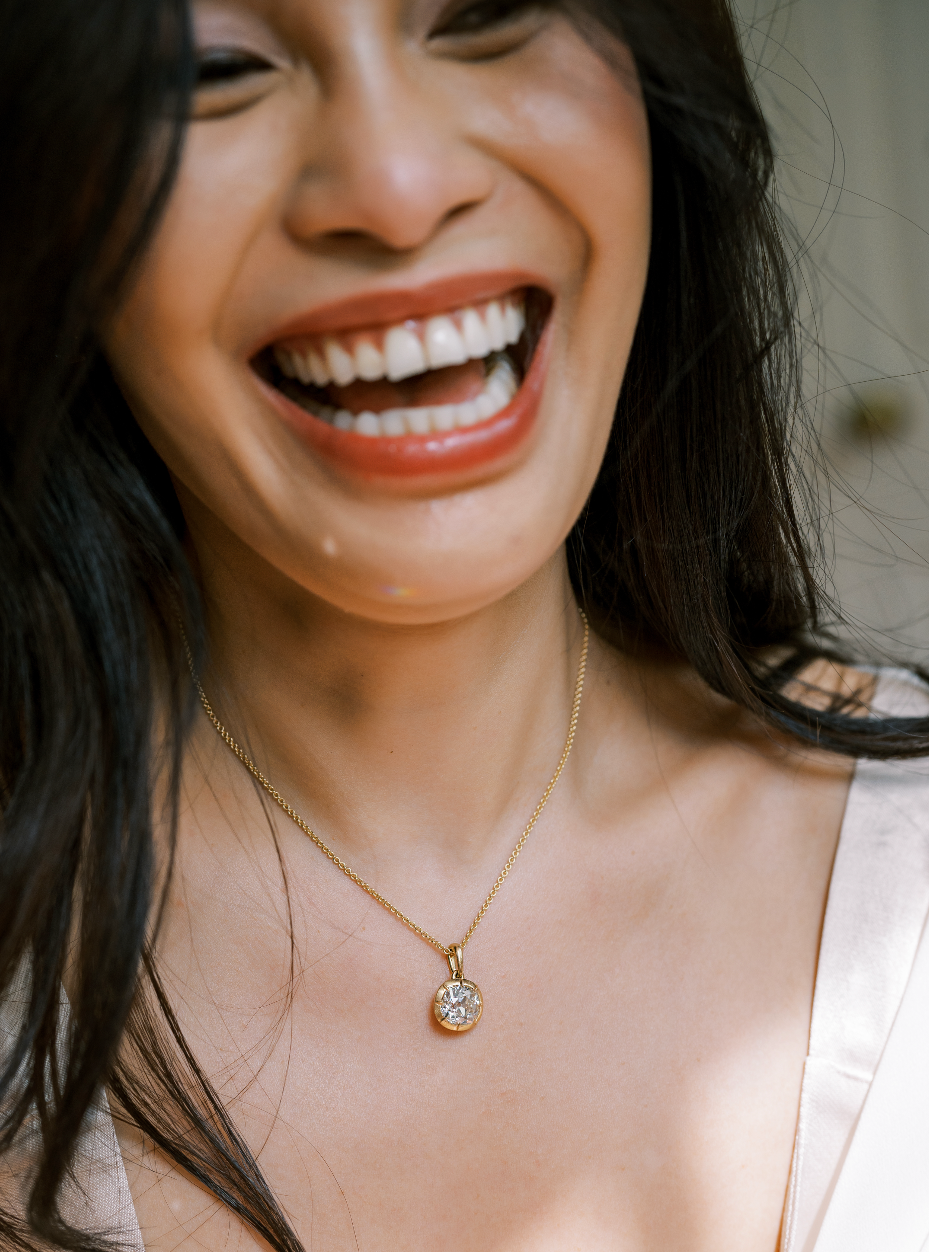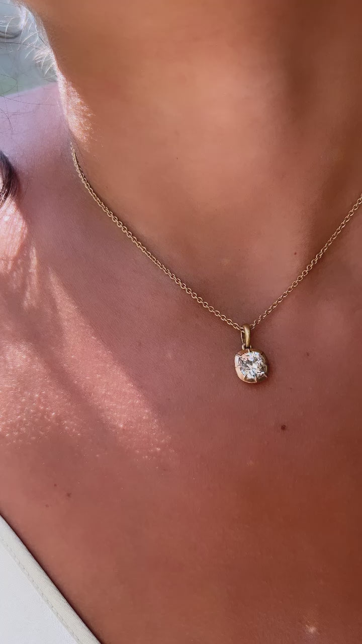 The Lulu Pendant 2.30 is an AB original made right here in NYC. The pendant features a GIA Certified 2.30-carat Old Mine Cut diamond of M color, SI2 clarity. The diamond is collet-set in an 18kt yellow gold setting with an 18kt gold bail to slide on any chain you desire.