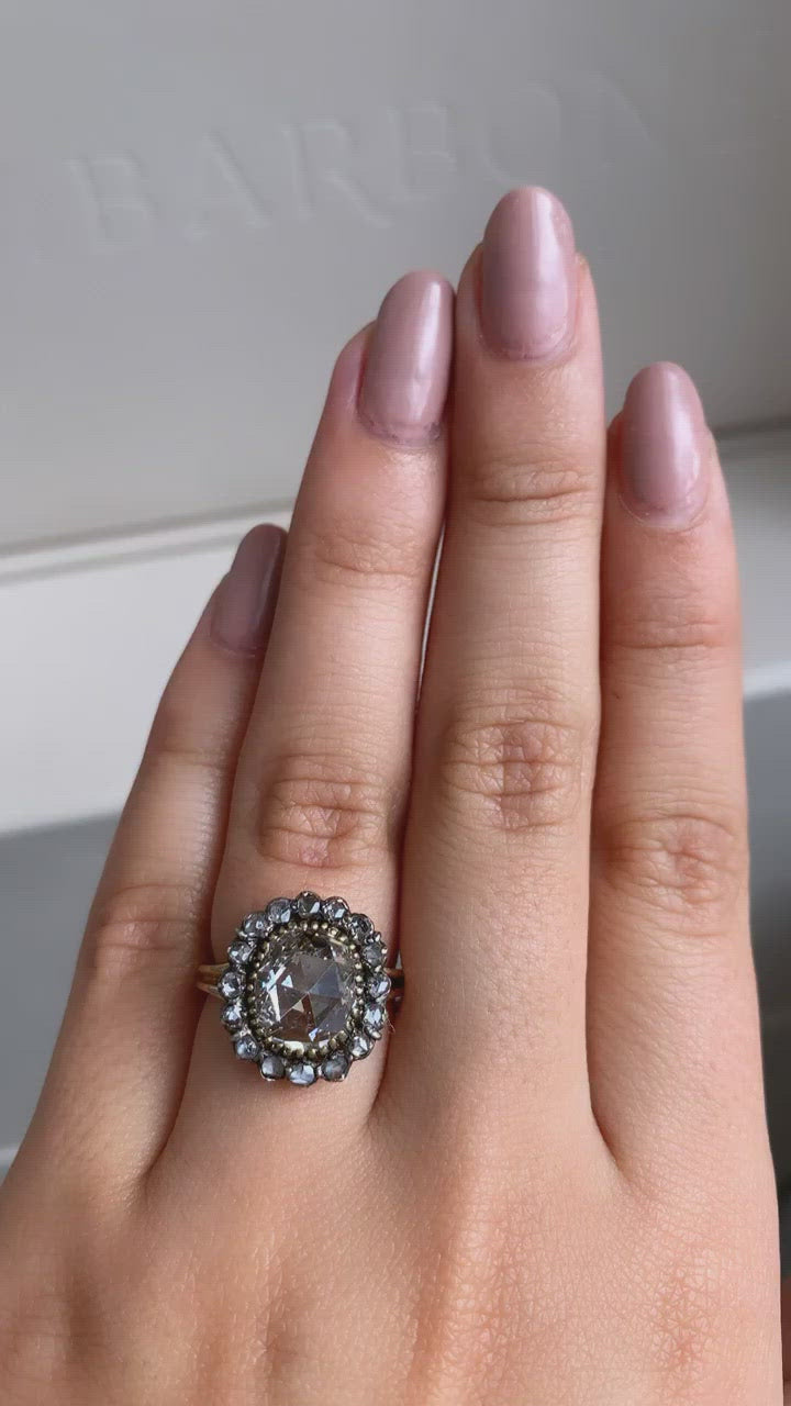 The Lunaria ring is an authentic Victorian era engagement ring circa 1850! The ring centers a very unique 2.51 carat rose cut diamond of J-K color, I1 clarity. The stone is set in silver-topped 14kt yellow gold setting with a halo of 16 rose cut diamonds. The ring has a split shank. The ring is currently size 6.25 and can be resized!