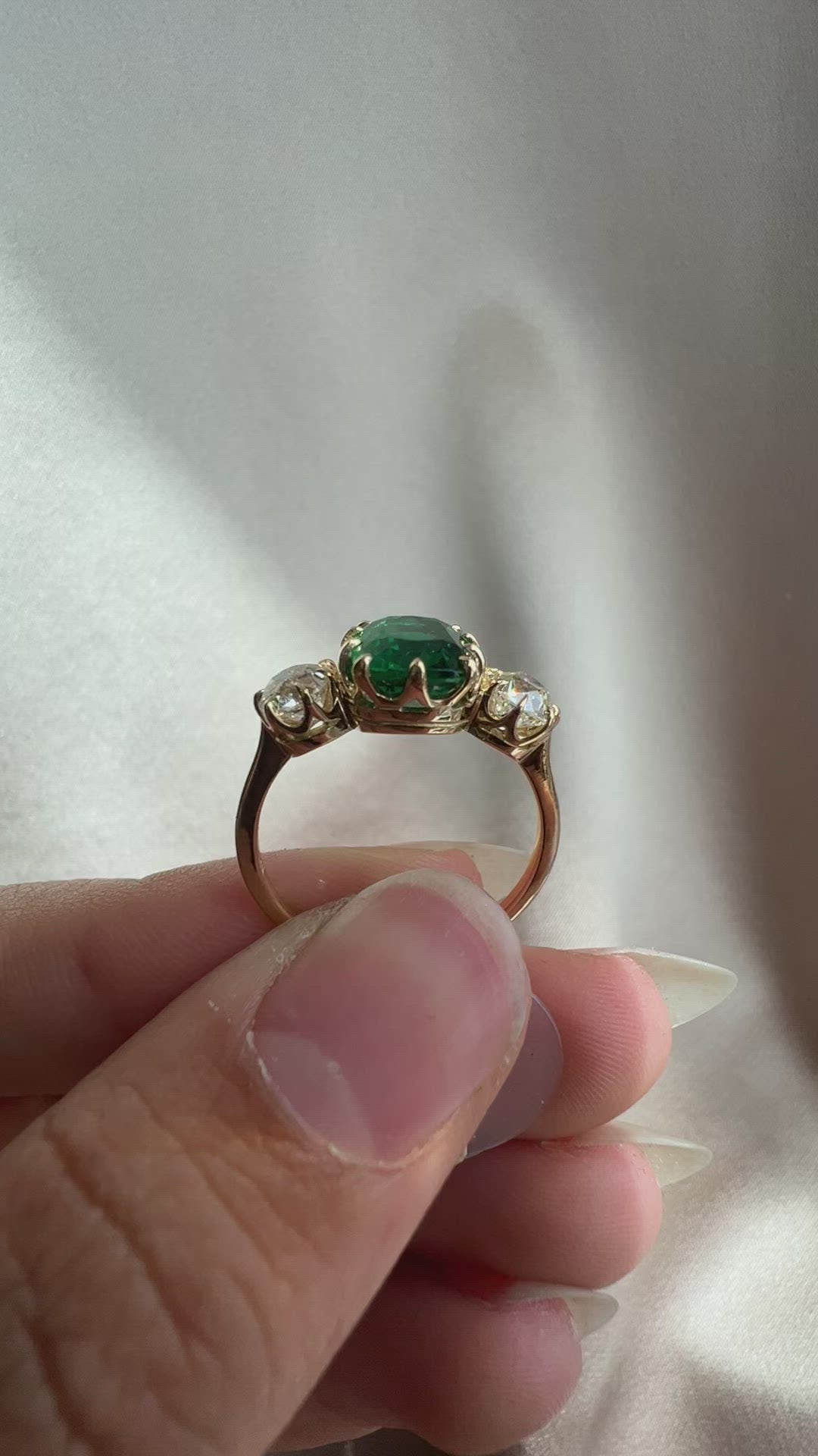 The hue and shape of this emerald make it the perfect center stone for this Mallory rendition. A deep, beautiful green that is complimented by the bright glimmer of these antique diamonds.