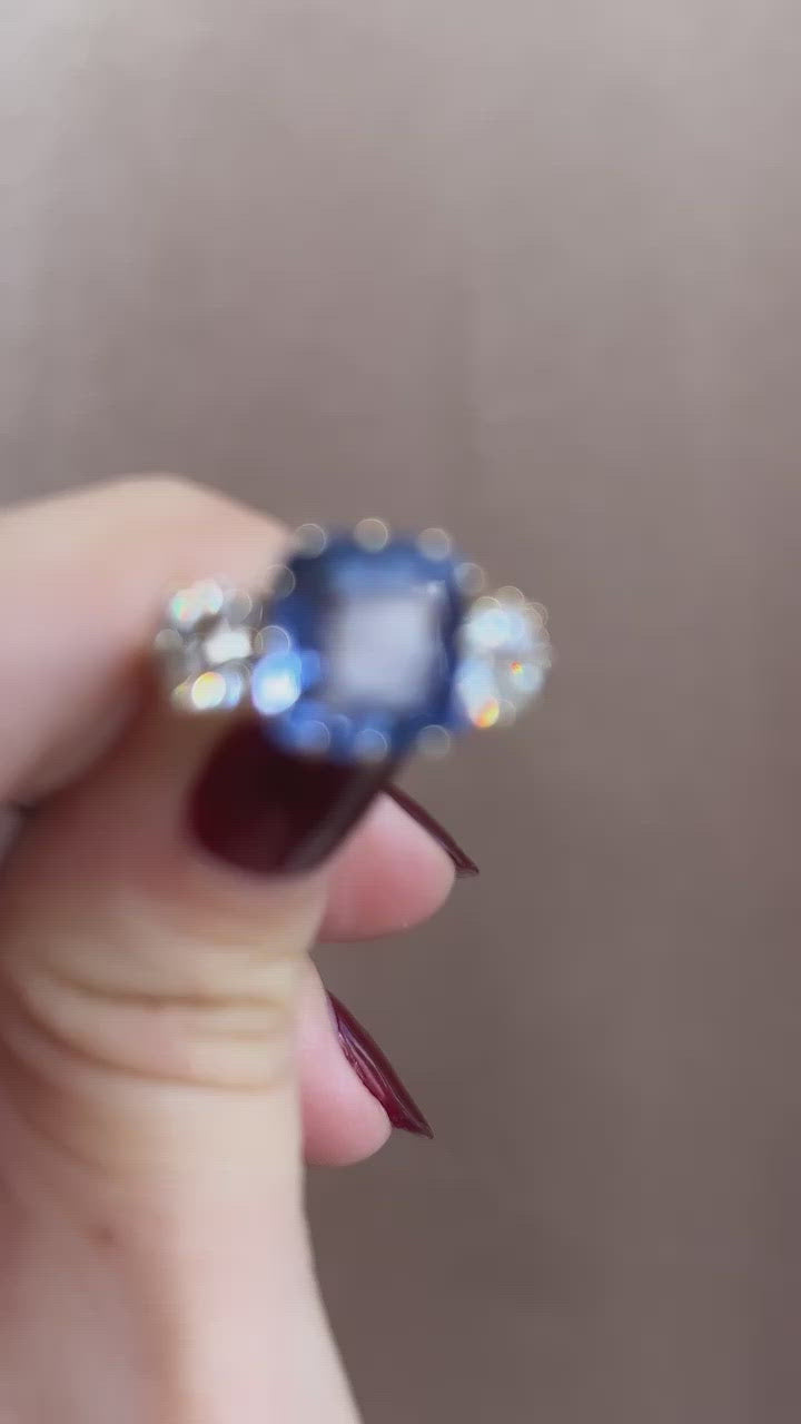 The Mallory 5.00 ring is a VB original design made right here in NYC. The ring centers a GIA-certified 5.00-carat cushion cut no-heat Sri Lanka Sapphire. The stone is set in a 12 prong 18kt yellow gold setting with an old European cut diamond of approximately H-I color, VS-SI clarity is set to each side of the center stone, both combining for 1.55 carats. The ring is currently size 6.25 and can be resized!