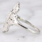 The Malory is a very distinct Art Deco navette-style platinum Engagement ring. The ring centers and old cut 0.15 ct marquise diamond graded H-I color and VS2 clarity. Each corner has a small single cut diamond. To the top and bottom are a baguette diamond that have a single cut diamond above and below those. There are and additional 16 single cut diamonds throughout the ring. The ring is a size 4.5 and can be resized!