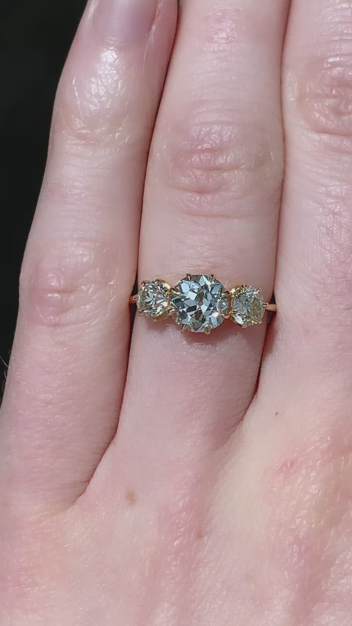 The Marielle 1.13 is a VB original design made right here in NYC. The ring centers a GIA-certified 1.13-carat Transitional cut diamond of N color, SI2 clarity. To each side is a transitional cut diamond of approximately that both combine for approximately 0.71 carats and M-N color, VS clarity. The ring is currently 5.75 and can be resized.