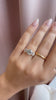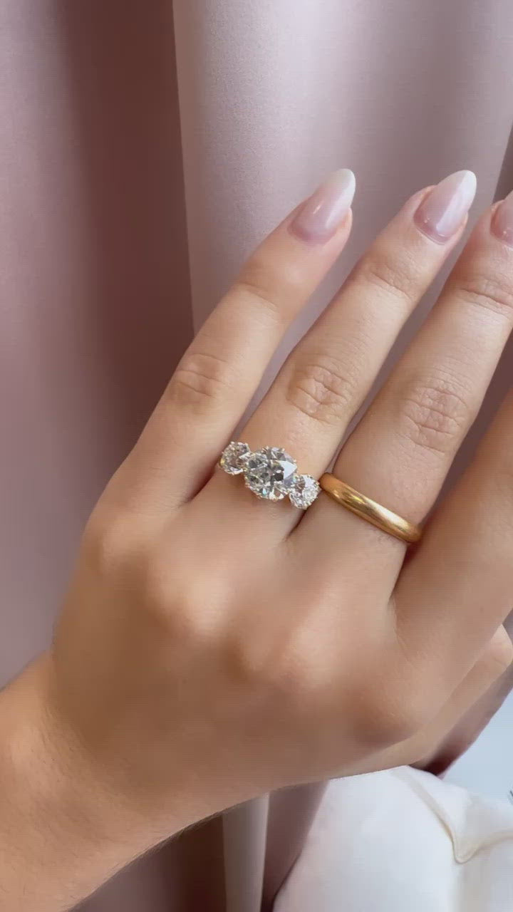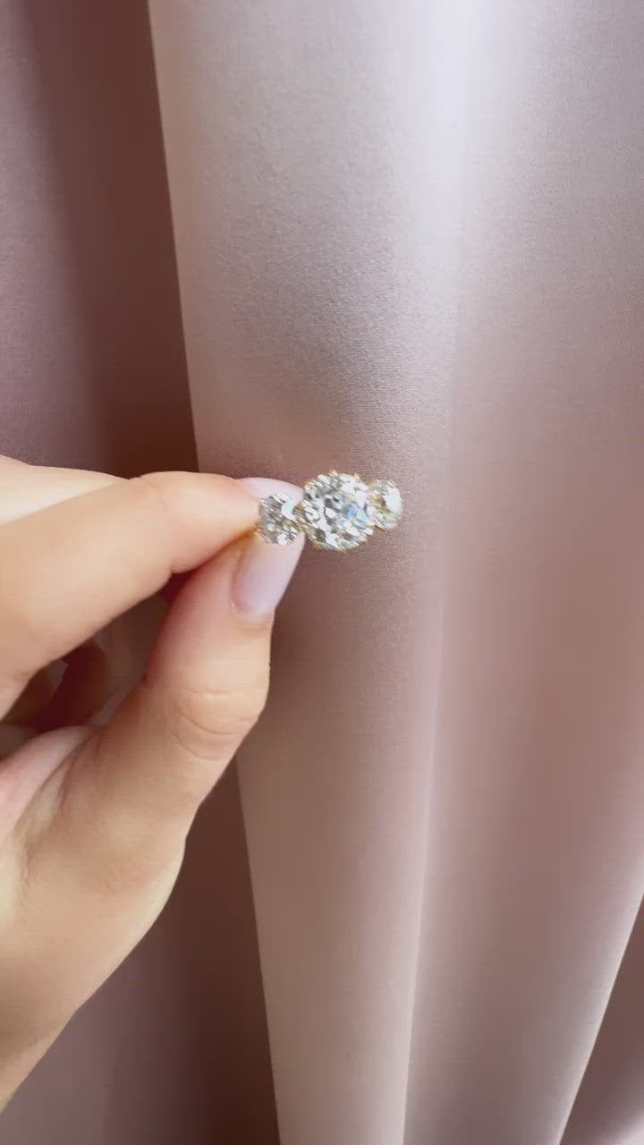 This Marielle is a three-stone lover's dream. A super bright and white center diamond that is called an Old European, but we think is a perfectly shaped stone that is a mix between an Old European and Old Mine. Large and chunky side stones, give this ring amazing finger coverage and shine!