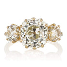 This center stone perfectly exemplifies what we love in old mine cut diamonds! It has gorgeous faceting that creates bright and beautiful sparkle, a beautiful high crown, and a dreamy cushiony shape. The side stones add the perfect finger spread for full-finger coverage.