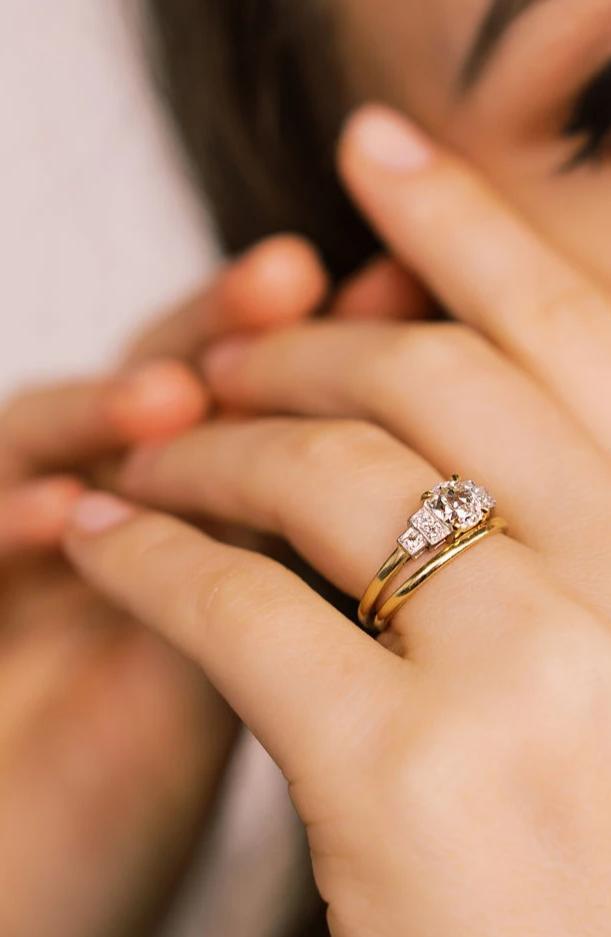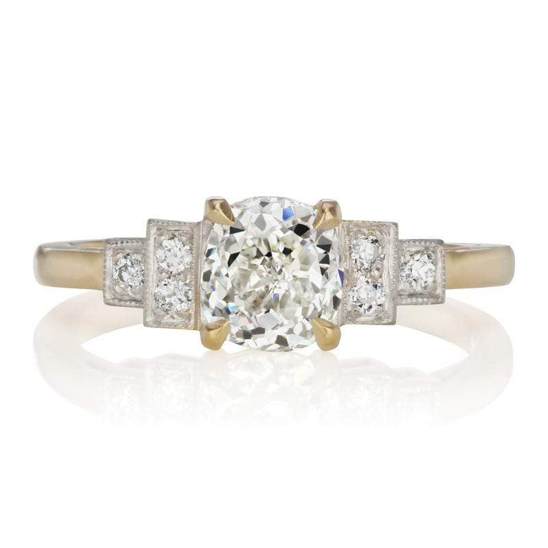 This ring is based on an authentic vintage ring we once had and adored. It centers a Crown Jubilee diamond set into a sleek, two-tone setting that spreads the finger beautifully.