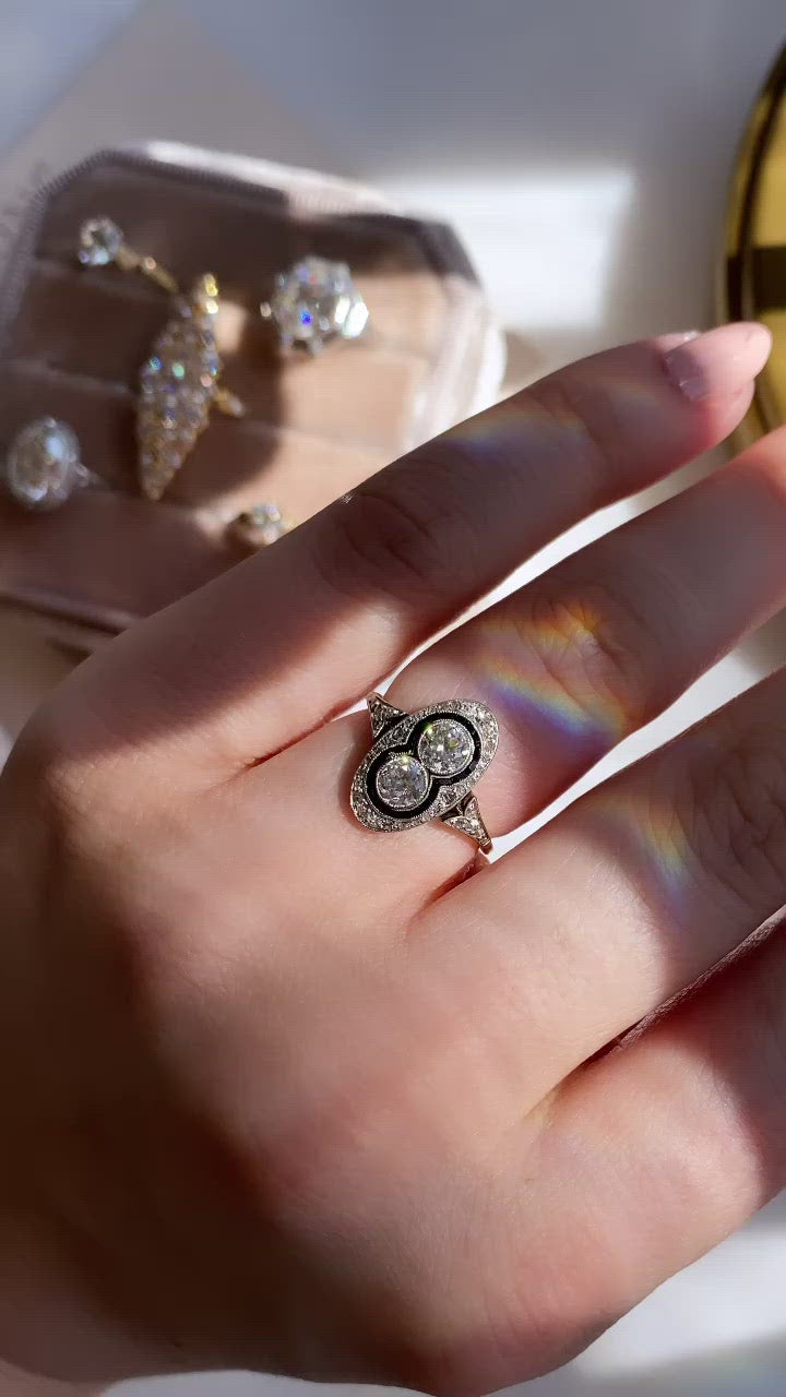The Mel ring is an authentic vintage ring from the Art Deco era circa 1915. The ring features two old European cut diamonds, combining for approximately 0.80 carats of I-J color, VS-SI clarity. The diamonds are bezel-set into a platinum topped yellow gold setting. Twenty-two calibré cut onyx are channel-set around the two center stones. Six total old European cut diamonds are set at the top of the face of the ring with 22 rose cut diamonds bead-set into the sides of the face of the ring. Four additional rose-cut diamonds decorate each of the shoulders. The ring is currently size 5.5 and can be resized!
