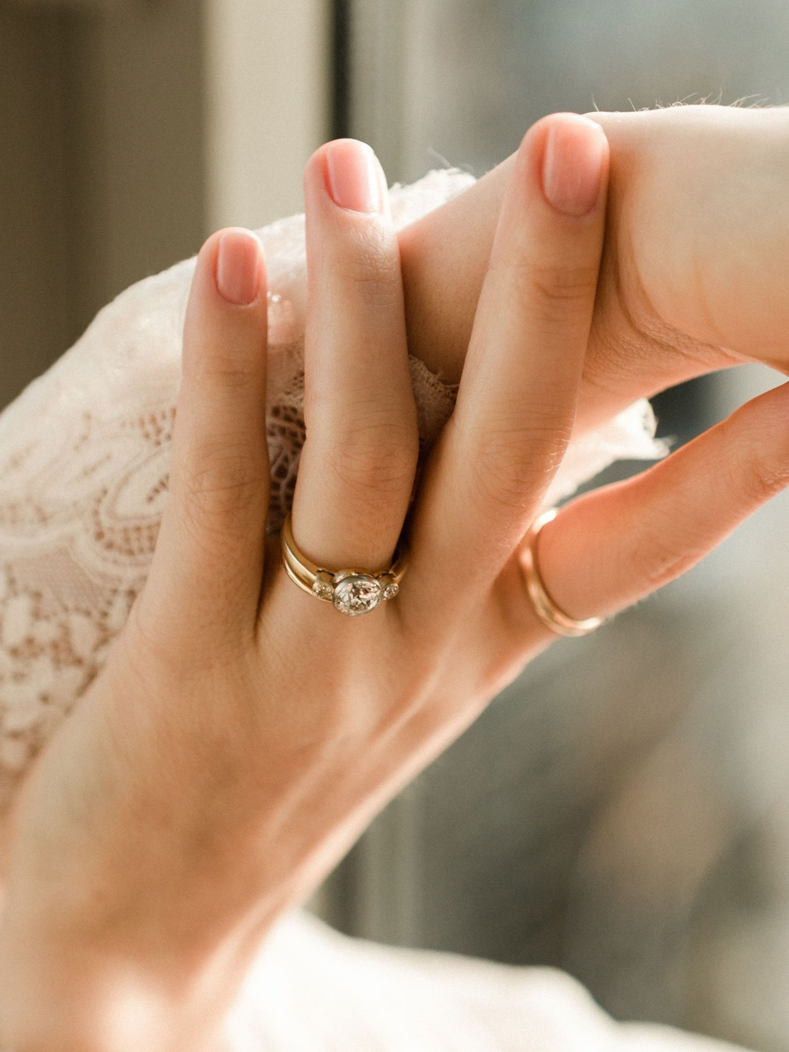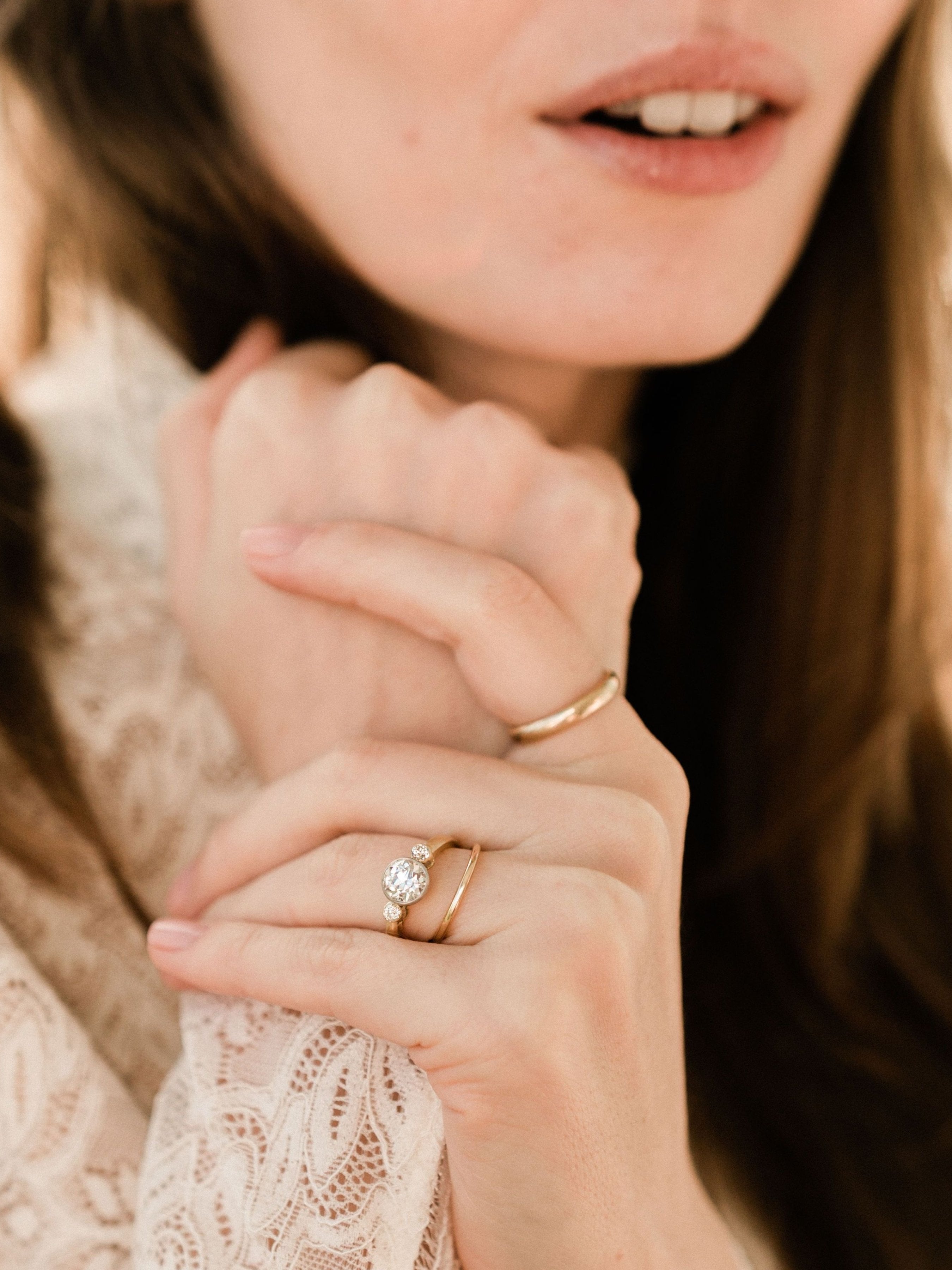 The Halle Ring is an authentic Edwardian engagement ring circa 1910. The ring centers a GIA Certified 1.25ct Old European Cut diamond of color K color, VS2 clarity. The stone is bezel-set in a platinum-topped 18kt yellow gold setting. To each side is a bezel-set old mine cut diamond, both combining for approximately 0.16 carats. The ring is size 5.75 and can be resized!