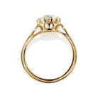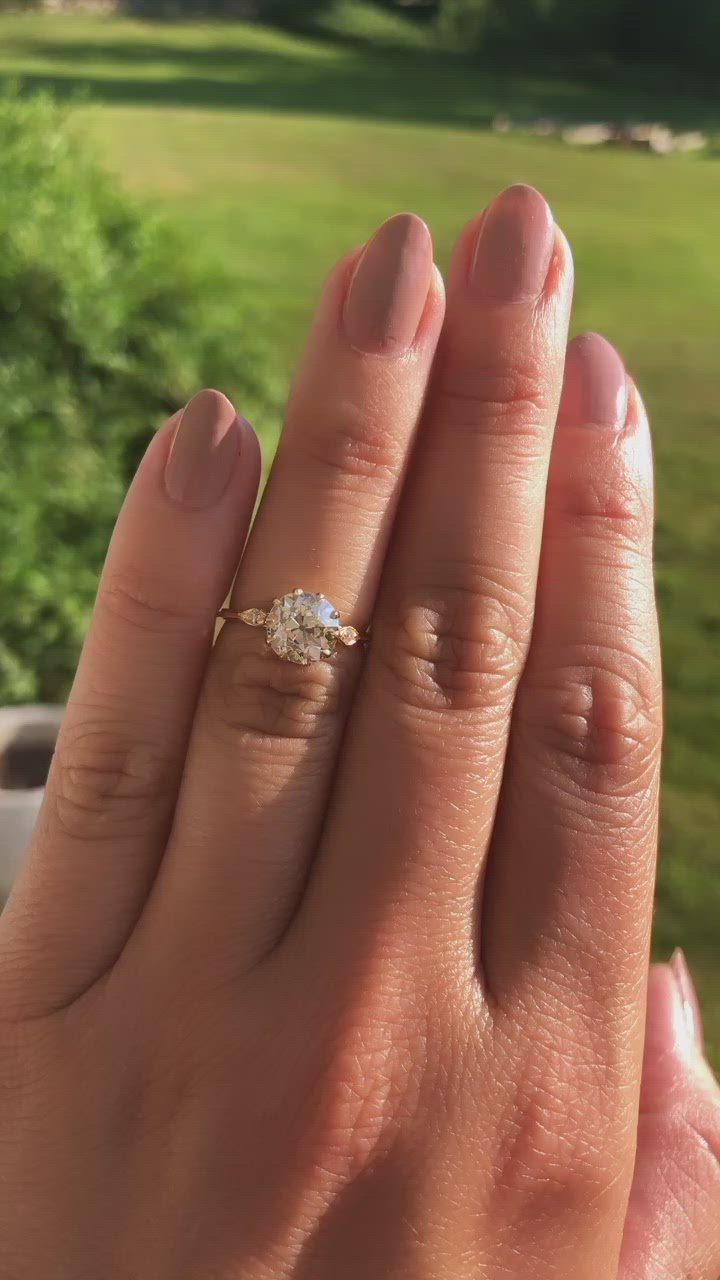 The Alva 1.82 ring is a vintage-inspired VB-made ring centering an authentic antique diamond. The ring centers a GIA certified 1.82-carat old European cut diamond of M color, VS1 clarity. The stone is set in an 18 karat yellow gold setting with a small antique diamond set into each shoulder of the ring. The ring is currently size 4.5 and can be resized!