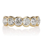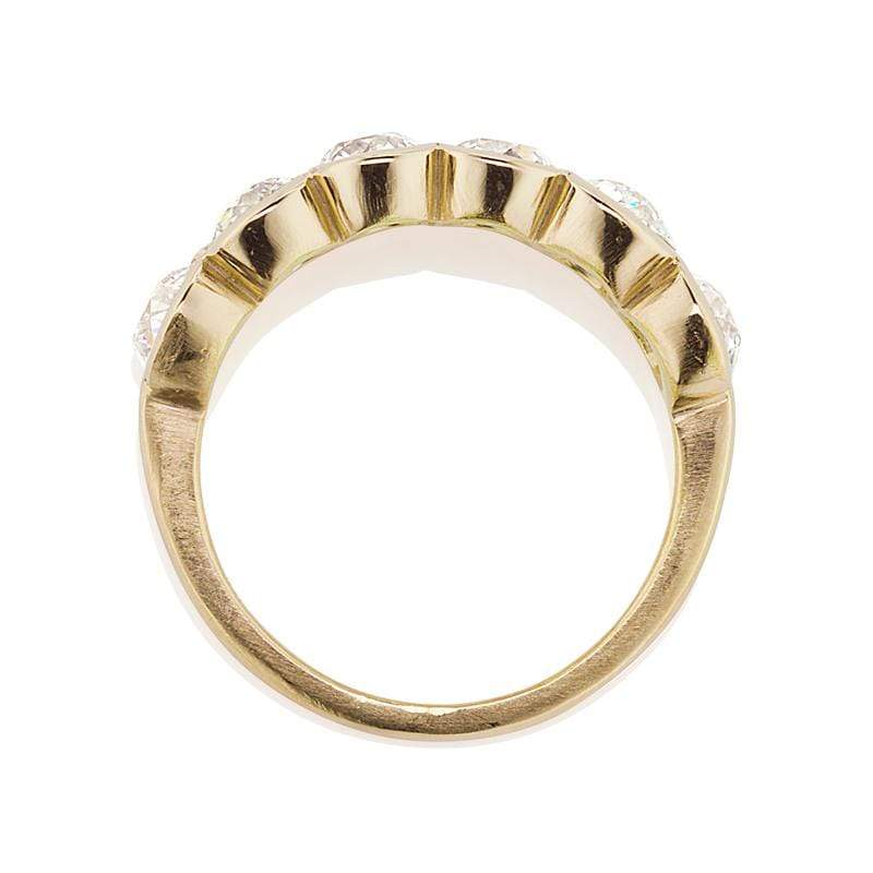 The Allure band is a vintage-inspired VB-made diamond band. The ring has 6 old European cut diamonds of I-J color, VS clarity. The diamonds combine for a total of 2.23 carats total. The diamonds are half bezel-set in an 18kt yellow gold setting. The ring is currently size 5.75 and can be resized!