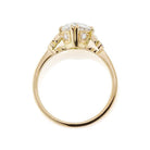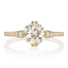 The Paloma 1.17 ring is a vintage-inspired VB-made diamond engagement ring. The ring centers a GIA certified 1.17-carat old European cut diamond of K color, VVS2 clarity. The diamond is set in 4 double prongs with a bezel-set french cut and a bezel-set old European cut diamond to each side. Four old European cut diamonds are bead-set into the gallery of the ring. The diamonds are all set in an 18 karat yellow gold setting. The ring is currently size 6 and can be resized!