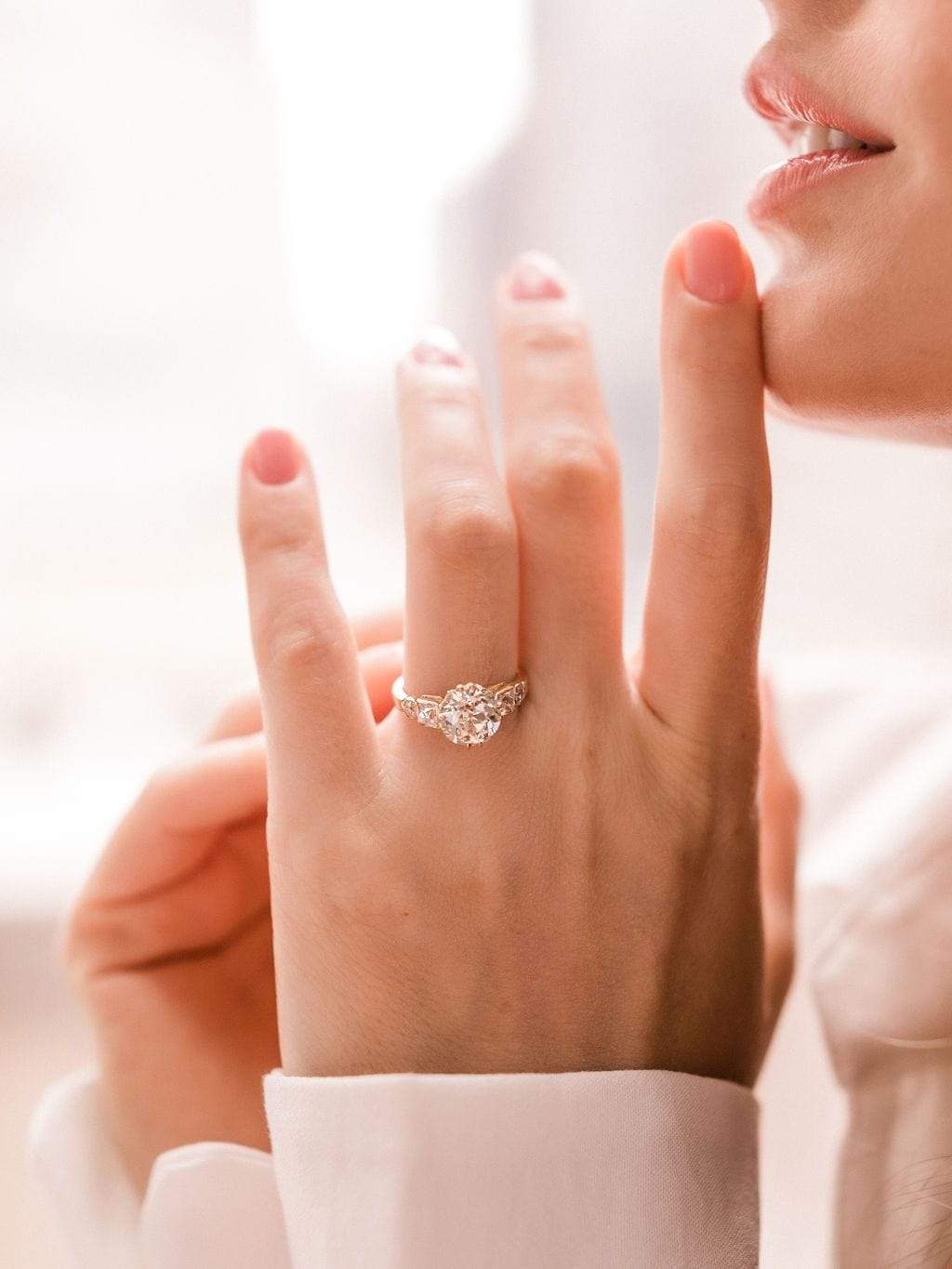 The Paloma 2.85 Ring is a Vintage-Inspired VB-made engagement ring with antique diamonds! This ring is based on the authentically vintage Paloma Ring! The ring centers a GIA Certified 2.85 carat old European cut diamond of M color, SI2 clarity. The diamond is set in a 4 double prong 18kt yellow gold setting and has a French cut diamond and an old European cut diamond that are each bezel-set on the shoulders. An additional 4 old European cut diamonds are set in the gallery of the ring. Millegrain detail has been applied to the edges of the shank. The side diamonds combine for approximately 0.85 carats. The ring is size 6 and can be resized!