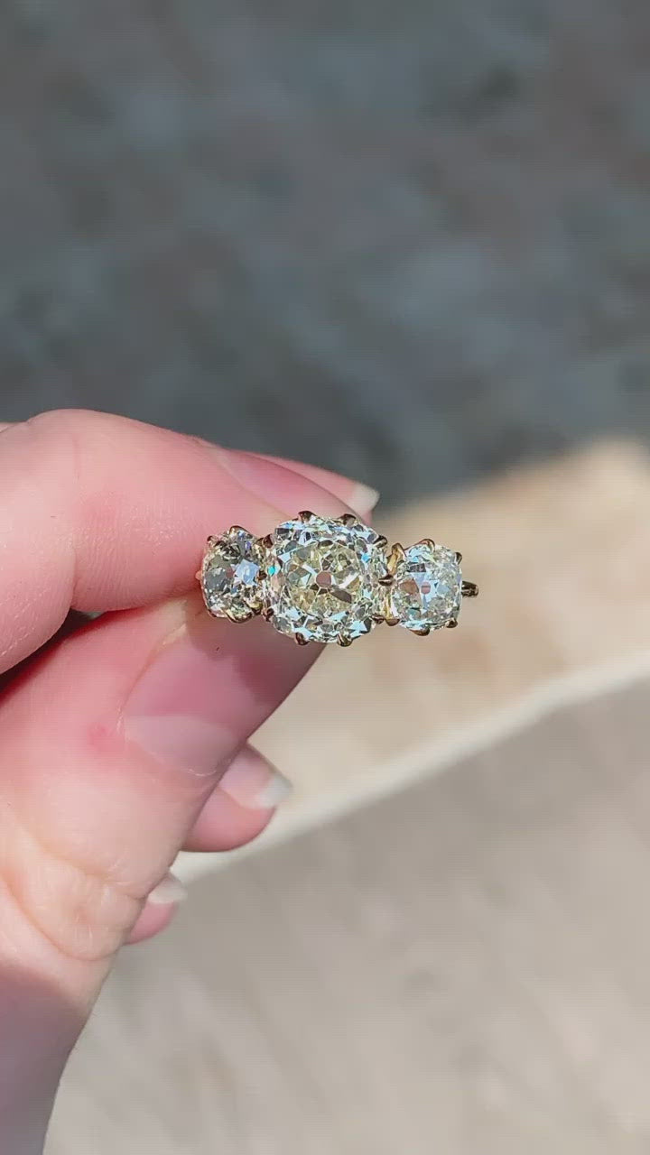 Old Mine Cut Diamond Three Stone Engagement Ring