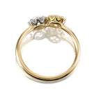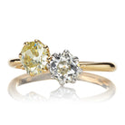 This toi-et-moi features a nearly colorless old mine cut and its warm yellow counterpart, the two coming together to form a harmoniously balanced ring. We love how the two stones play off the other, each making the other shine even brighter. The stones come from different antique pieces but their faceting patterns are so similar, making them a perfect pair found amongst the thousands. A perfect ring for those who love the symbolism of the piece- a sun and a moon, two opposites coming together as one- or for those who just think it's pretty! :)