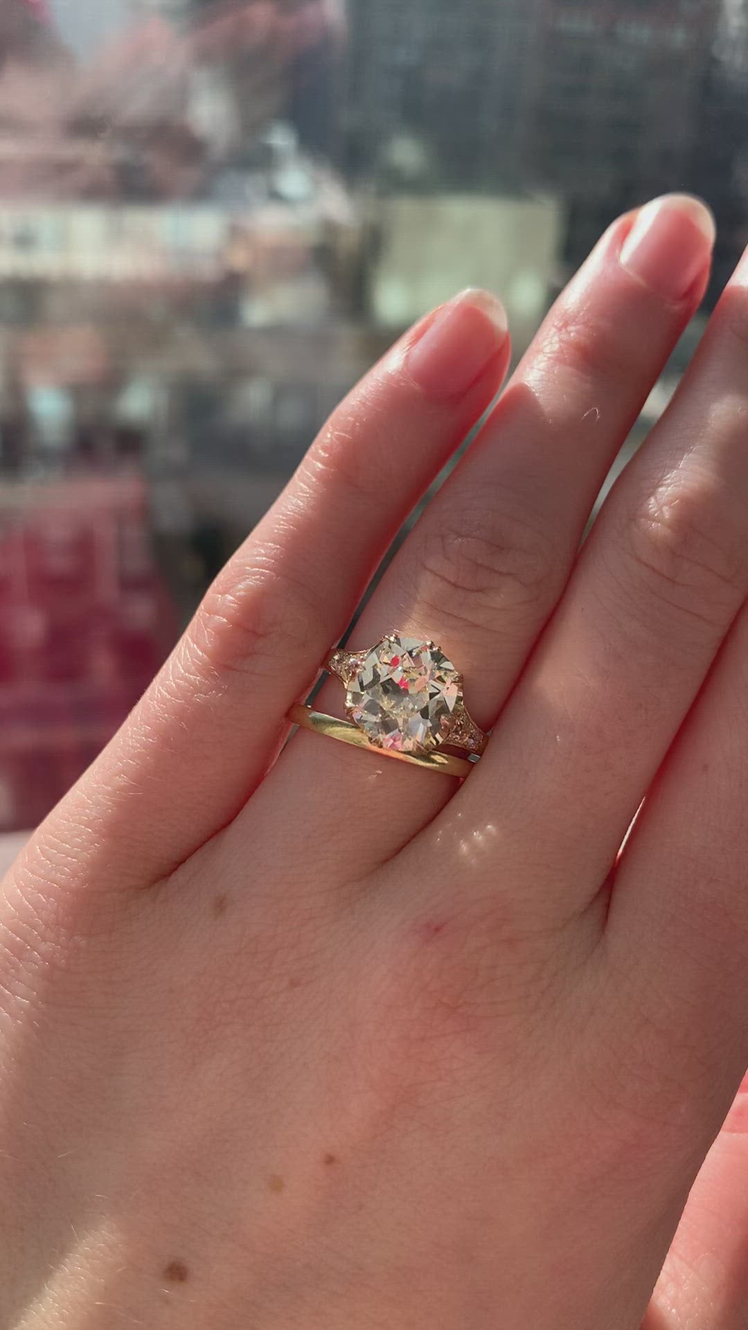 The Cherry 3.12 ring is a VB original design made right here in NYC using authentically antique diamonds. The ring centers a GIA certified 3.12-carat old mine cut diamond of O-P color, VS1 clarity. The stone is set in an 8-prong 18 karat yellow gold setting with two old mine cut diamonds bead-set into each of the shoulders. The ring is currently size 6 and can be resized!