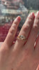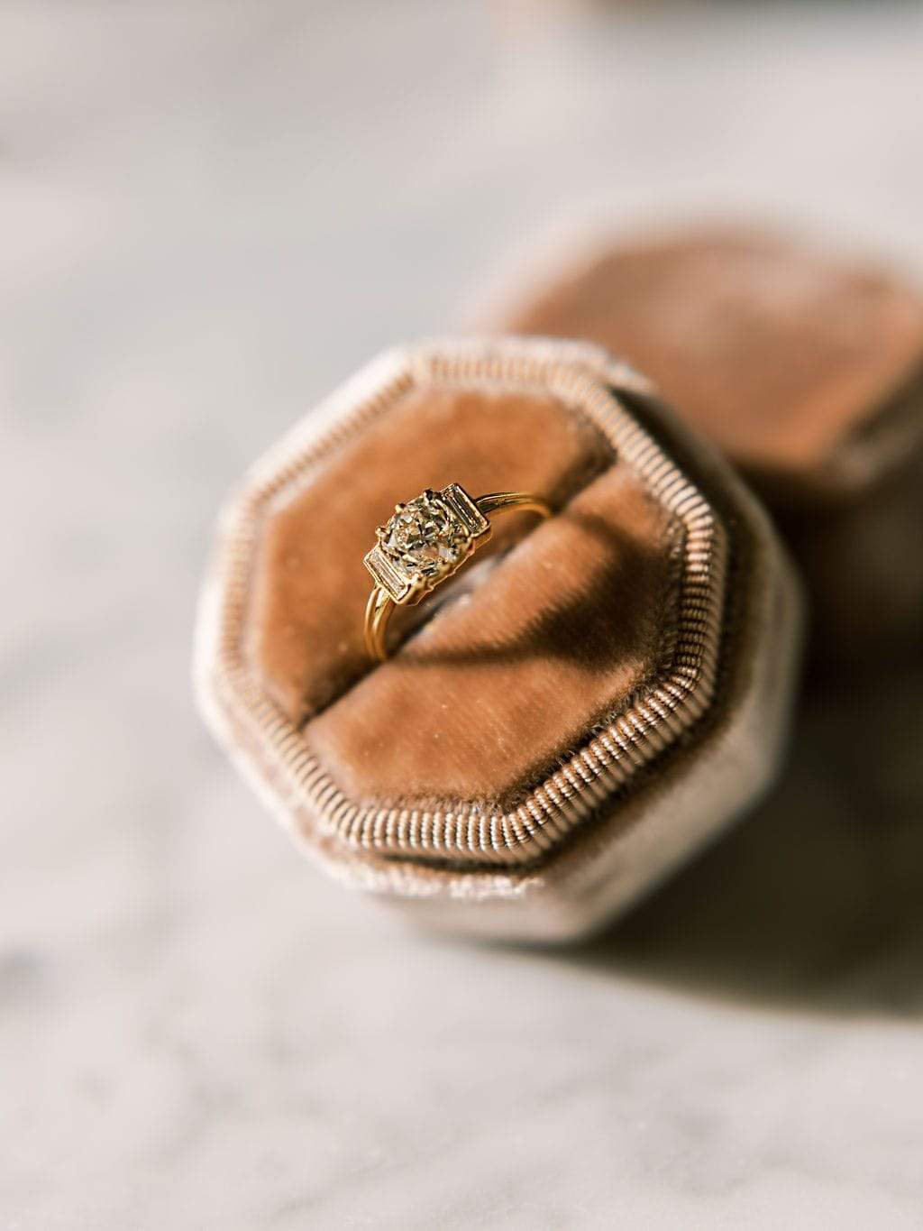 The Petra 1.22 ring is a VB original made right here in NYC centering an authentically antique diamond. The ring centers a GIA certified 1.22-carat old mine cut diamond of J color, SI2 clarity. The stone is set in a 6-prong 18 karat yellow gold setting with a vertically-set baguette is to either side of the center stone. The ring is currently size 6.25 and can be resized!
