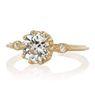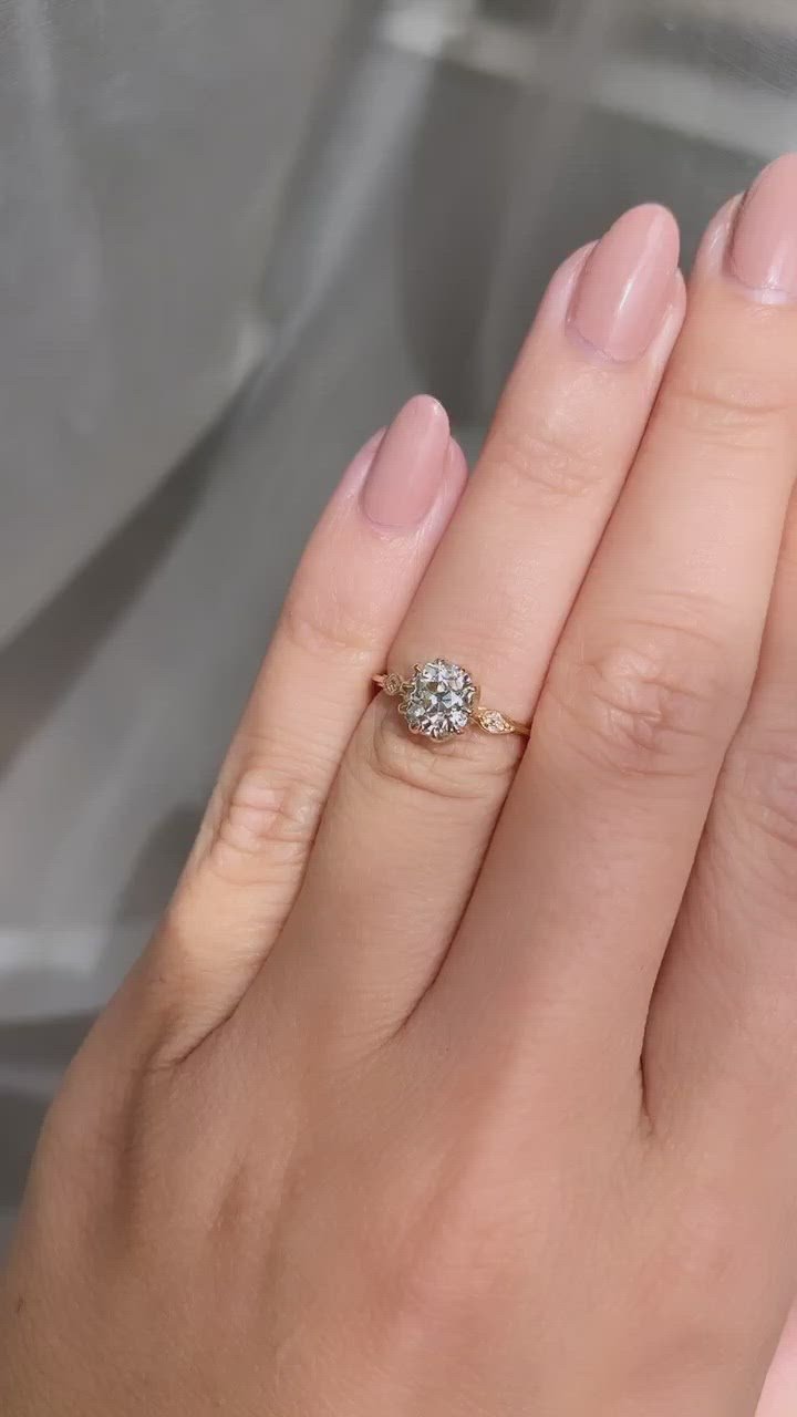The Alva 1.18 ring is a vintage-inspired VB-made diamond engagement ring with an authentically antique diamond. The ring centers a GIA certified 1.18-carat old mine cut diamond of J color, VS2 clarity. The stone is set in an 18 karat yellow gold setting with a little old mine cut diamond to each side. The ring is currently size 4.75 and can be resized!