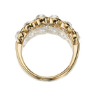 This Allure band features lovely warm hues in the chunkiest old mine cuts. The bezel setting offers a gold heavy look we adore. Set nice and low to the finger, this ring looks great stacked or alone.