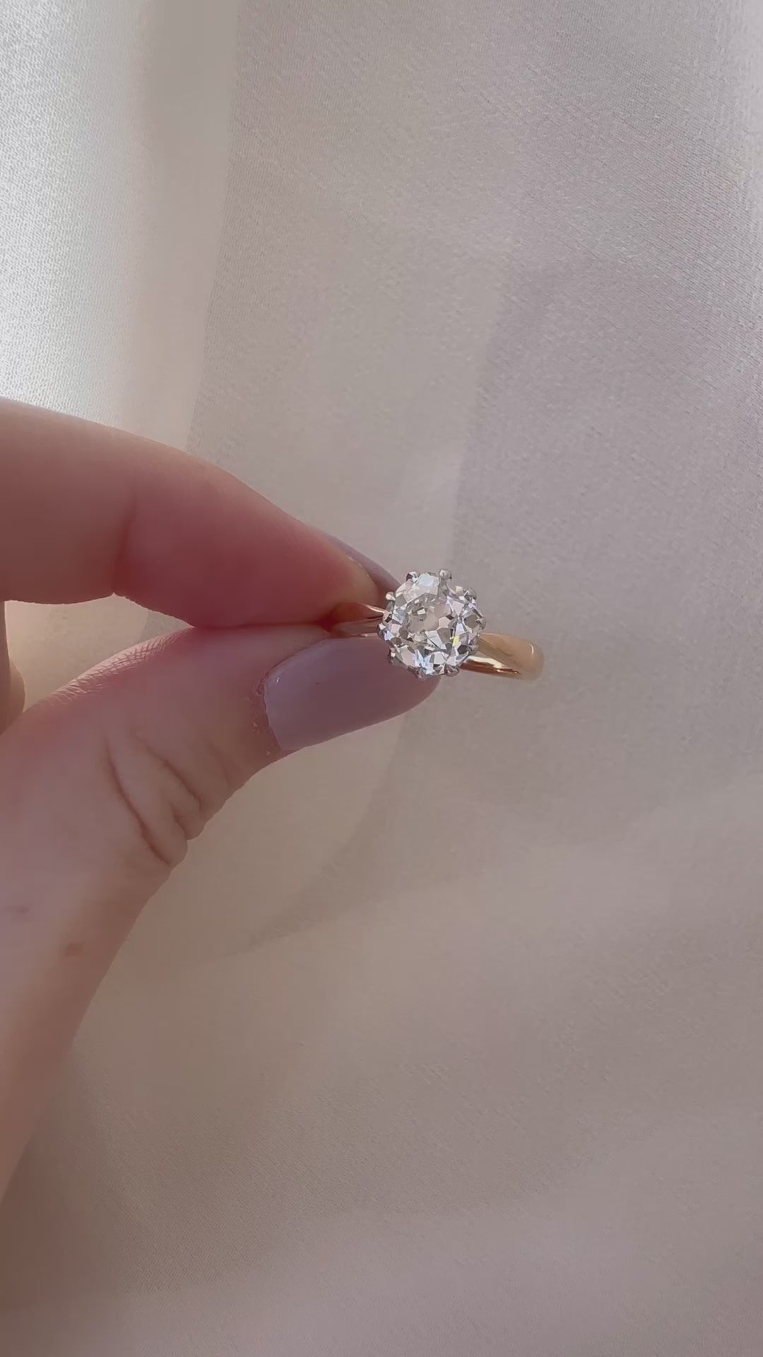 This antique diamond is what makes us love this ring so much! Charming and chunky with such a beautiful make, she shines and plays with light so beautifully. The platinum prongs emphasize the diamond's bright color and the rose gold creates a warm, Victorian-inspired feel.
