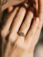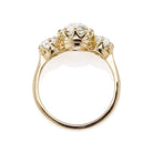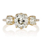 The Marielle 2.14 ring is a VB-made diamond engagement ring. The ring centers a GIA certified 2.14-carat old mine cut diamond of M color, SI1 clarity. The stone is set in a 10-prong 18kt yellow gold setting. To each side of the center stone is an old mine cut diamond, both combining for 0.84 carats. The ring is currently size 6 and can be resized!