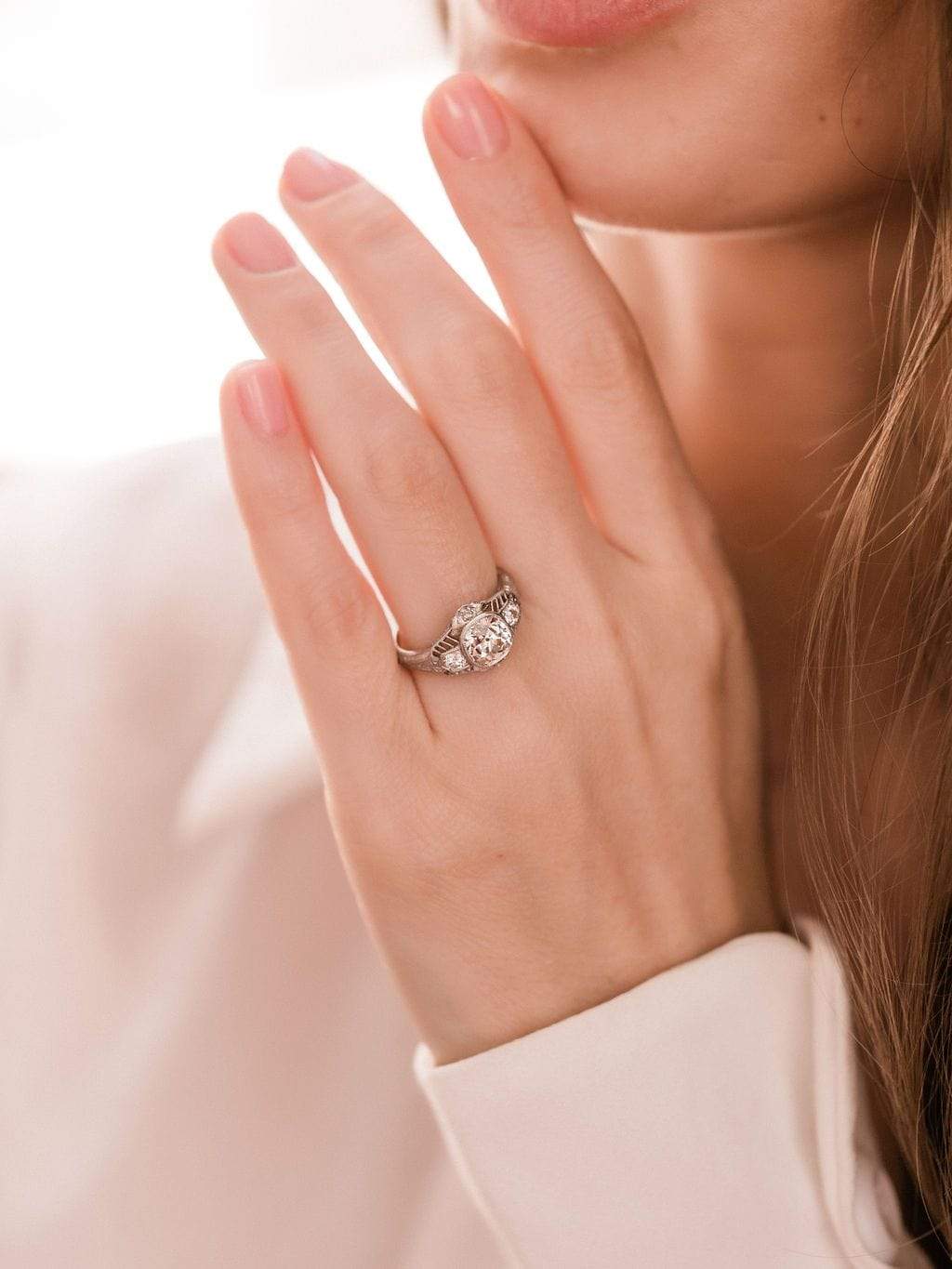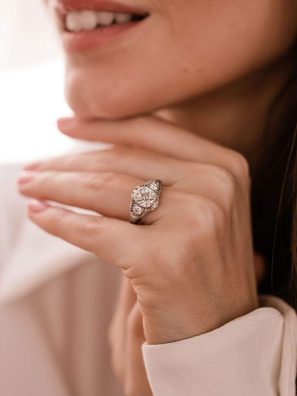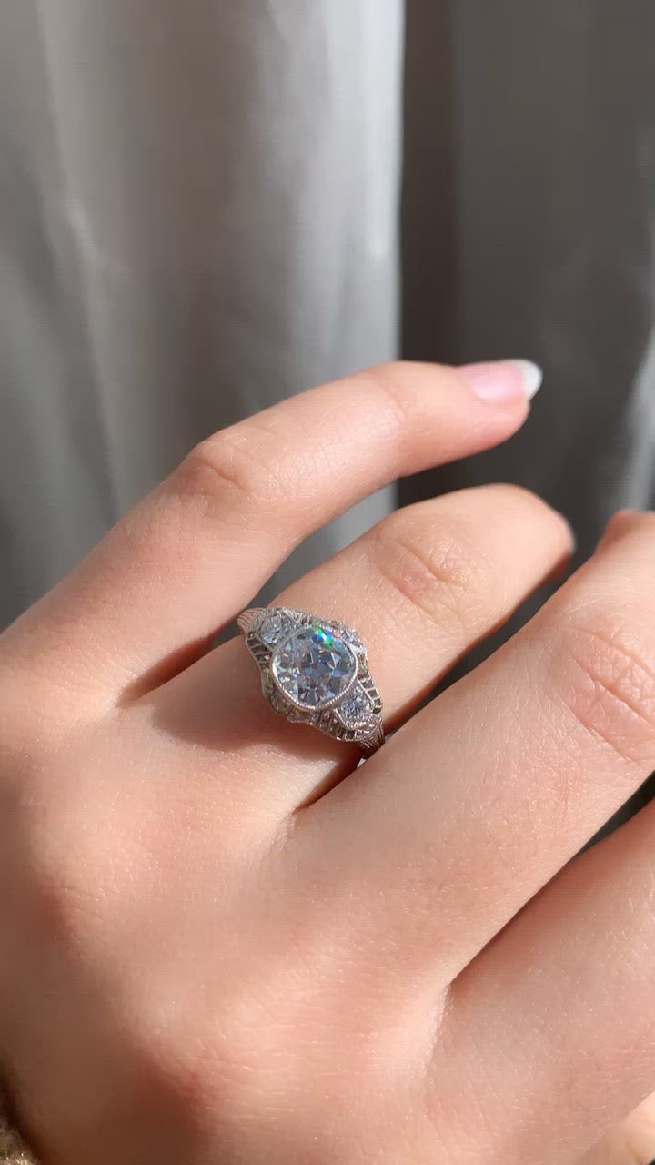 The Cale ring is an authentic vintage engagement ring from the Art Deco era circa 1920! This Engagement Ring With Bezel Set Side Stones centers a GIA Certified 1.55 carat old mine cut diamond of L color, SI2 clarity. To each side and above of the center stone is a bezel-set old European cut diamond of approximately J-K color, VS clarity and combine for approximately 0.12 carats. The ring is currently size 6.25 and can be resized!
