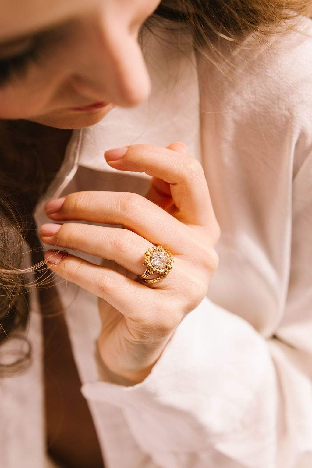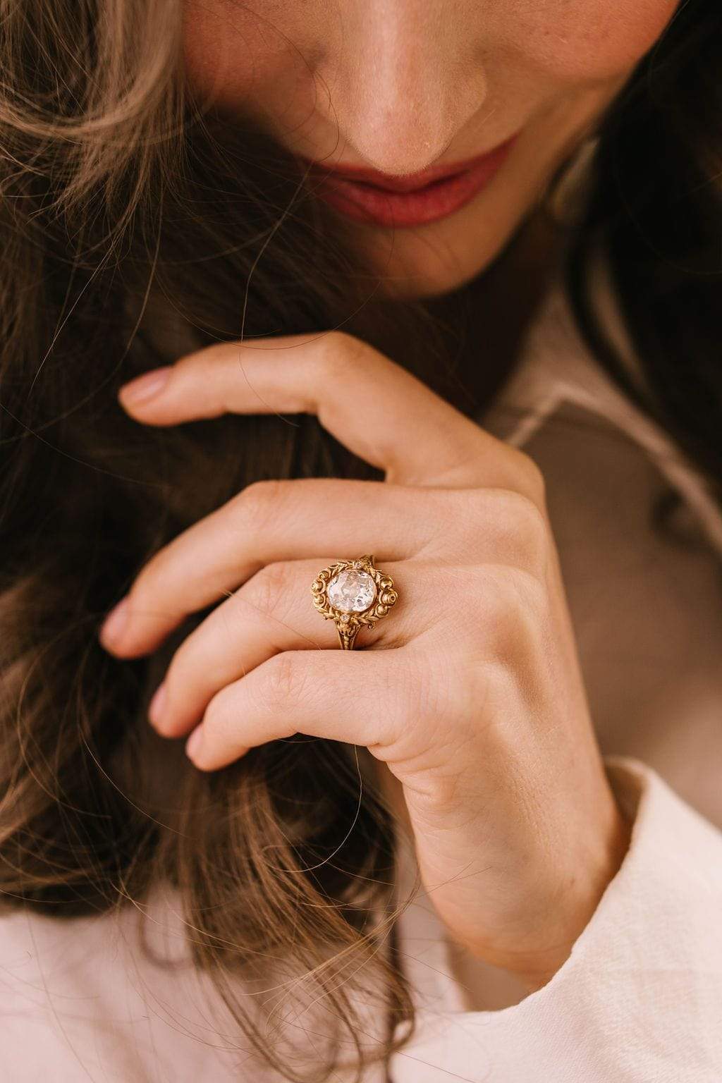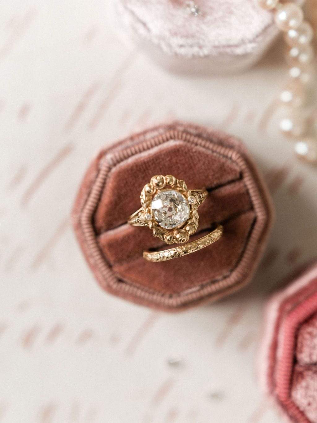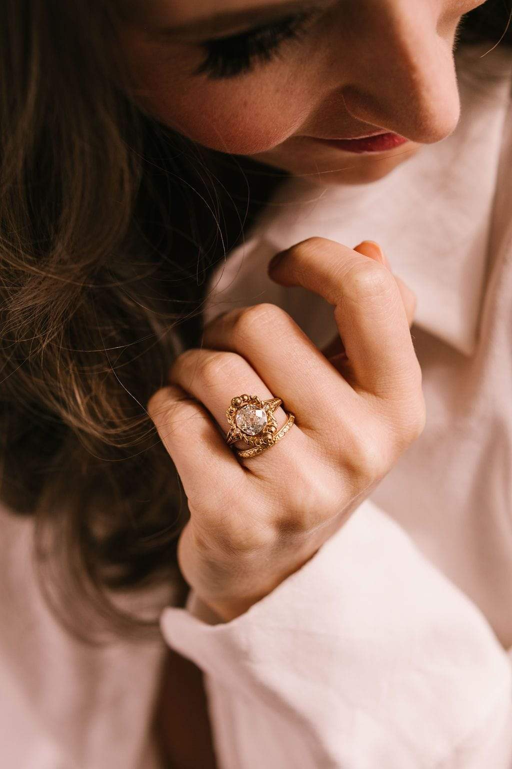 A very unique piece based on an authentic French Art Nouveau piece that we once had! The diamond is just dreamy and the setting is unbeatable. Elegant, low-profile, and with excellent finger coverage!
