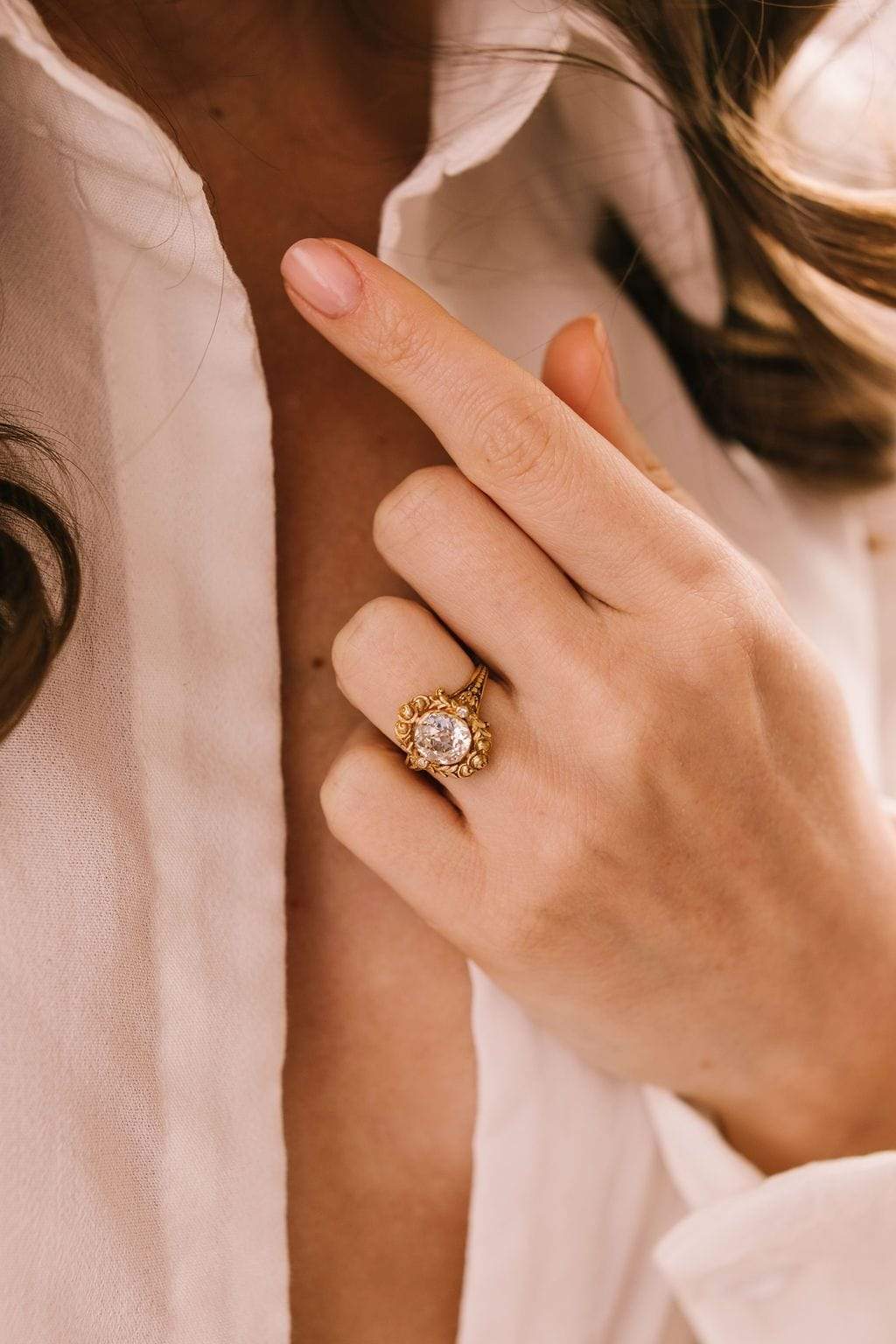 The Mira 1.77 ring is a vintage-inspired VB made engagement ring with an authentically antique diamond! This Oval Cushion Cut Diamond Engagement Ring centers a GIA Certified 1.77 carat old mine cut diamond of K color, VS2 clarity. The diamond is bezel set in an 18kt yellow gold ring with a carved floral golden halo. To each side is a small old European cut diamond that is bezel-set. The shoulders have gorgeous metalwork and engraved details. The ring is currently size 6 and can be resized!